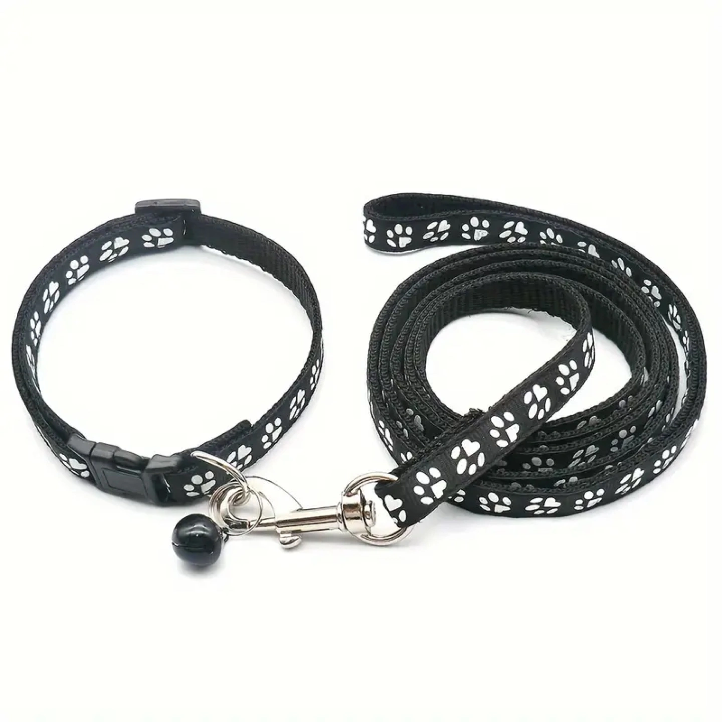 Cute pet collar and leash set. Features paw print design. Includes a small bell. Available in multiple colours.