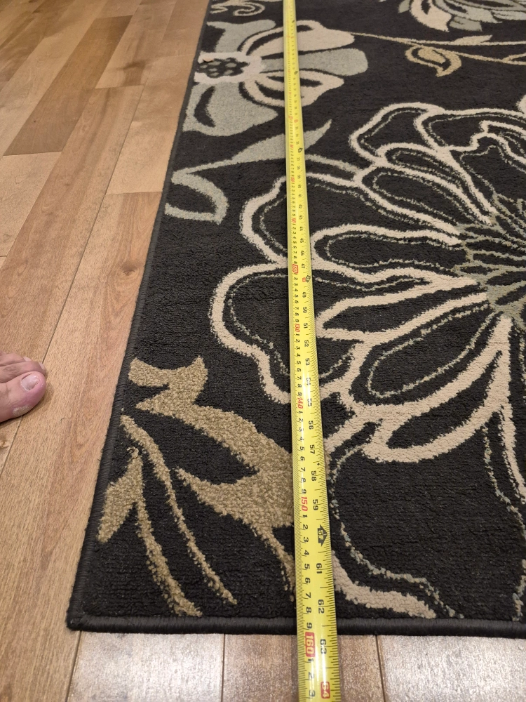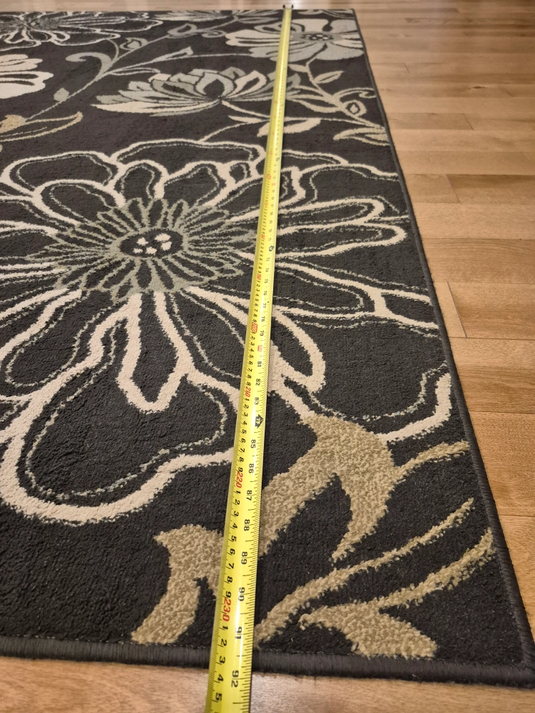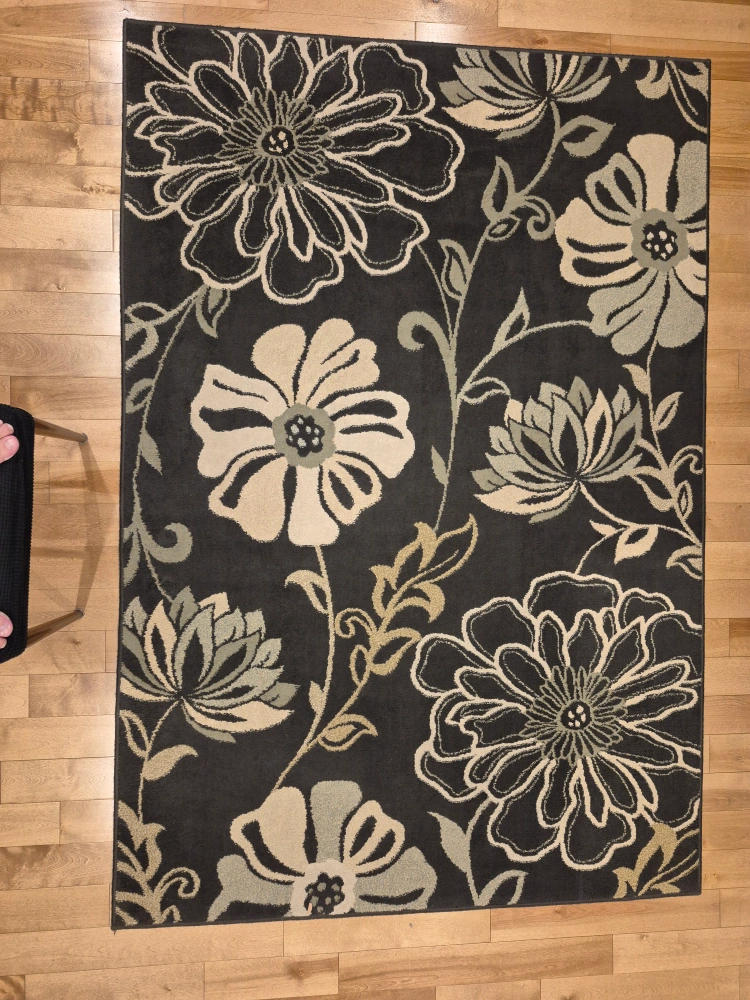 Beautiful large area rug. Features a dark brown background with beige and green floral pattern. Measures approximately 80 inches by 56 inches. Soft and comfortable underfoot. Excellent condition.