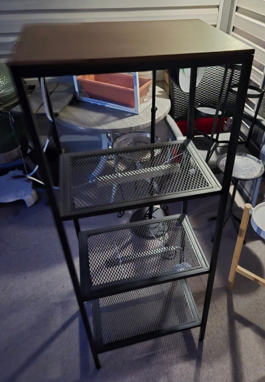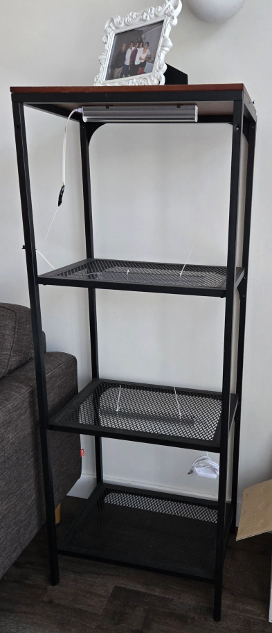 Four-shelf unit with growing light if you want to start an early seeding or keep your indoor 🪴 cozy. Black metal frame. Wooden top shelf. Great for organizing books, plants, or storage boxes. Good condition. Plus pots and other miscellaneous items needed for an indoor garden. and small IKEA greenhouse house.