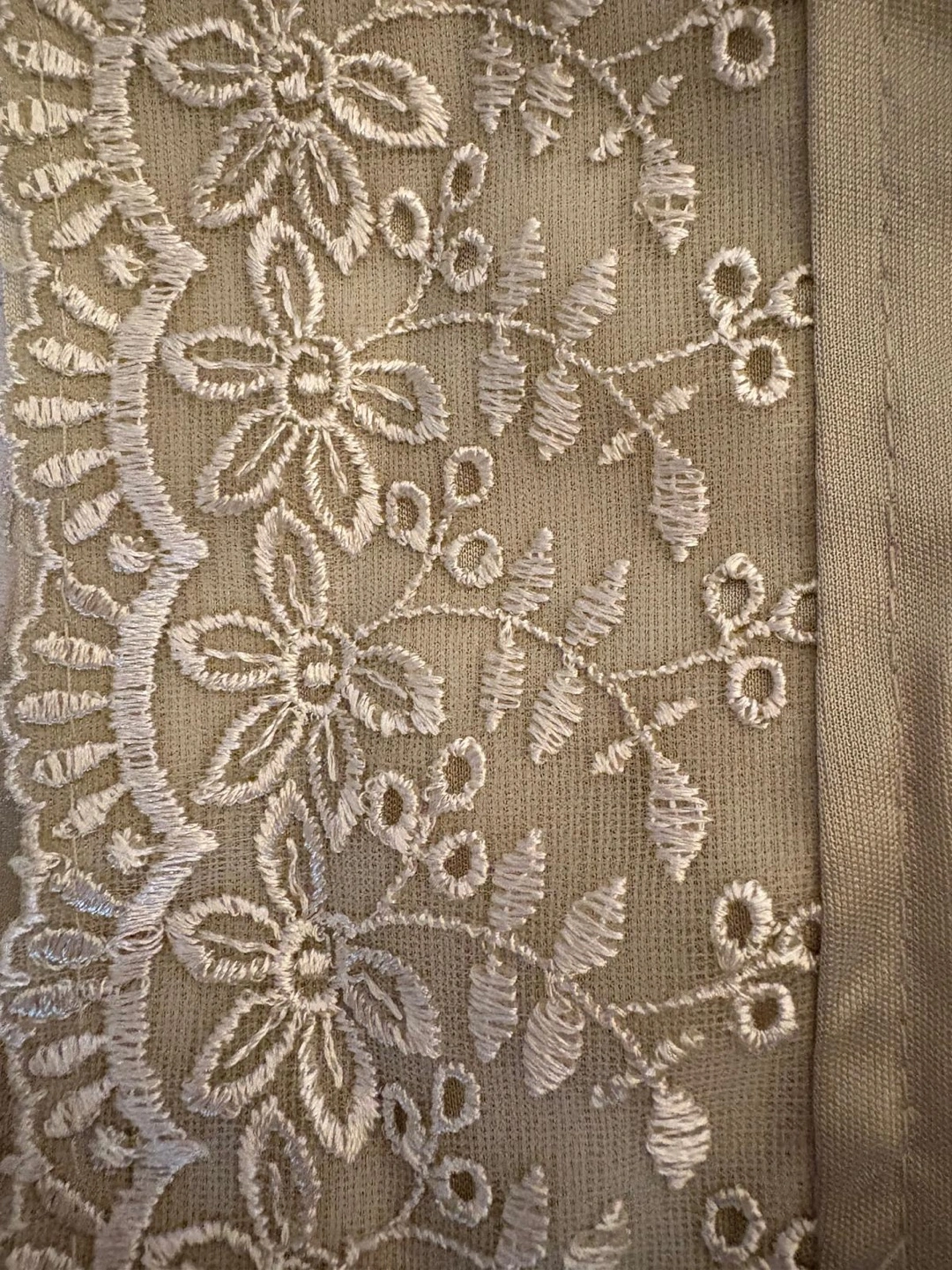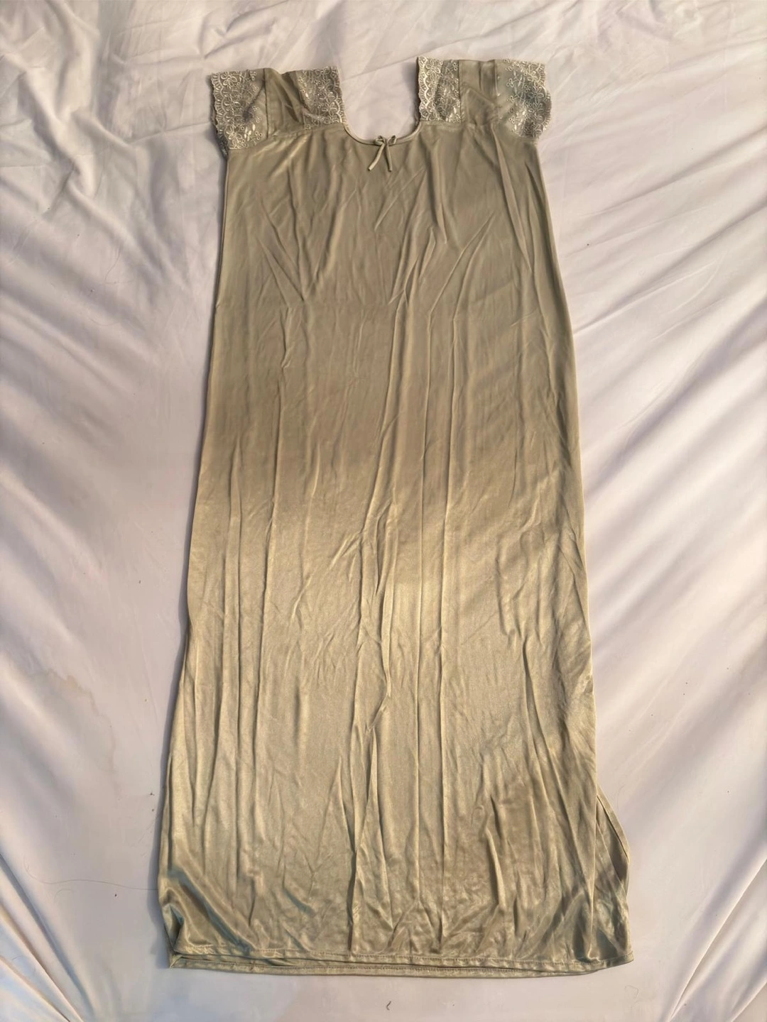 Price is negotiable. Beautiful and elegant nightgown in a soft champagne beige color, featuring delicate floral lace embroidery on the sleeves for a romantic touch. Made from a silky, lightweight fabric that feels smooth and breathable, perfect for a comfortable night’s sleep.
