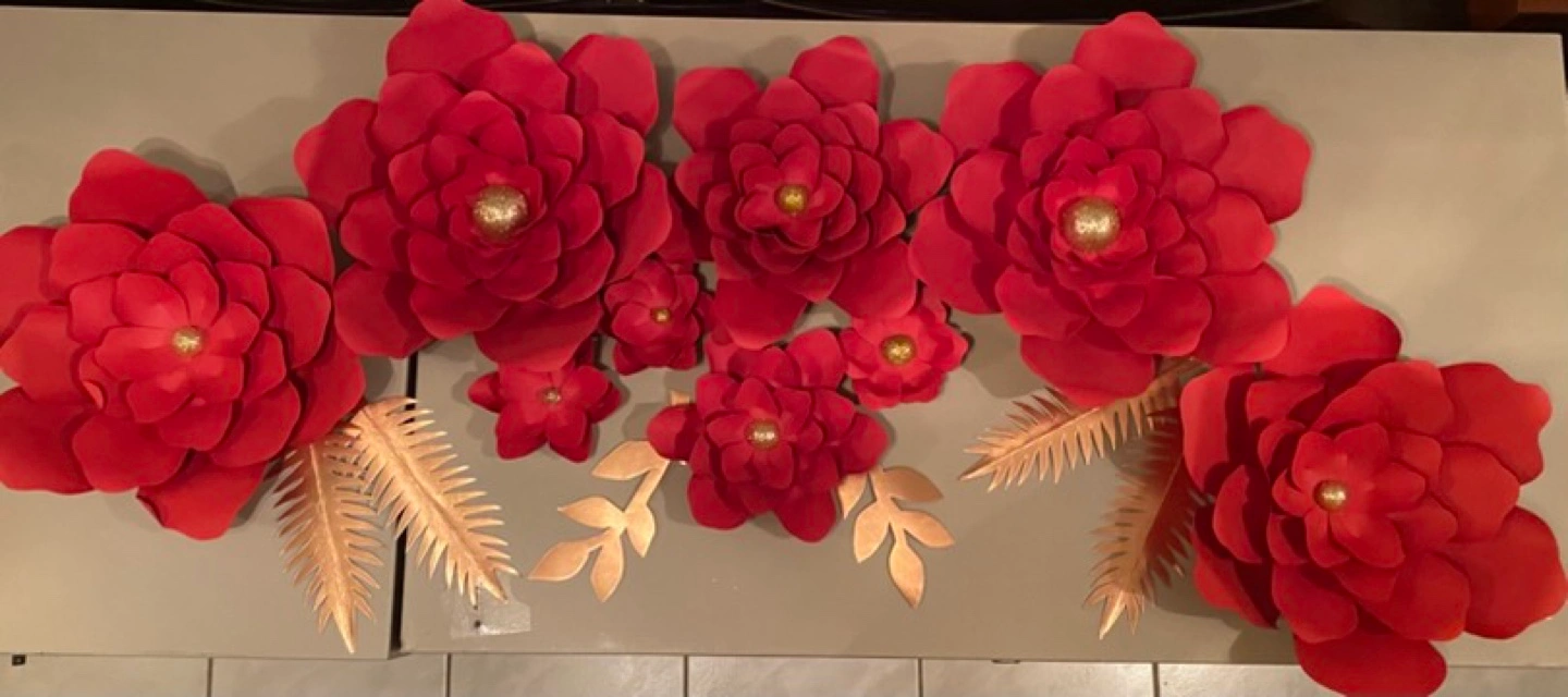 Large and small red paper flowers. Gold accents and leaves included. Perfect for weddings or parties.