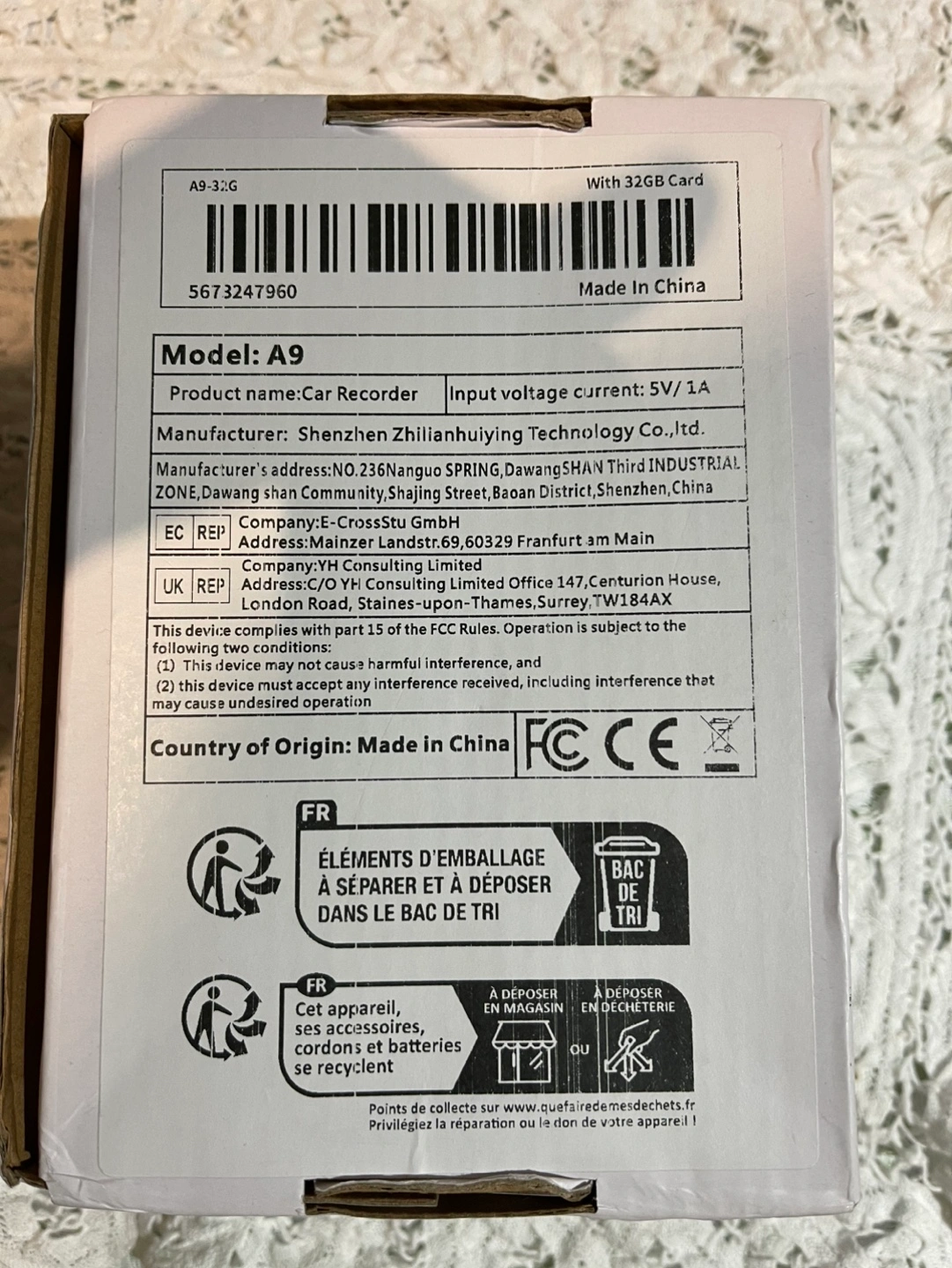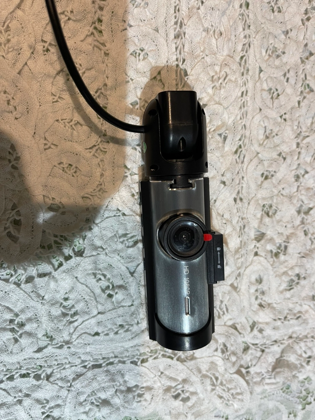 Pre-owned A9 model dash cam. Includes 32GB card. Small screen. Compact design. Includes power cord. Made in China.