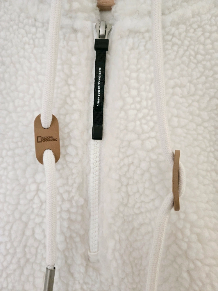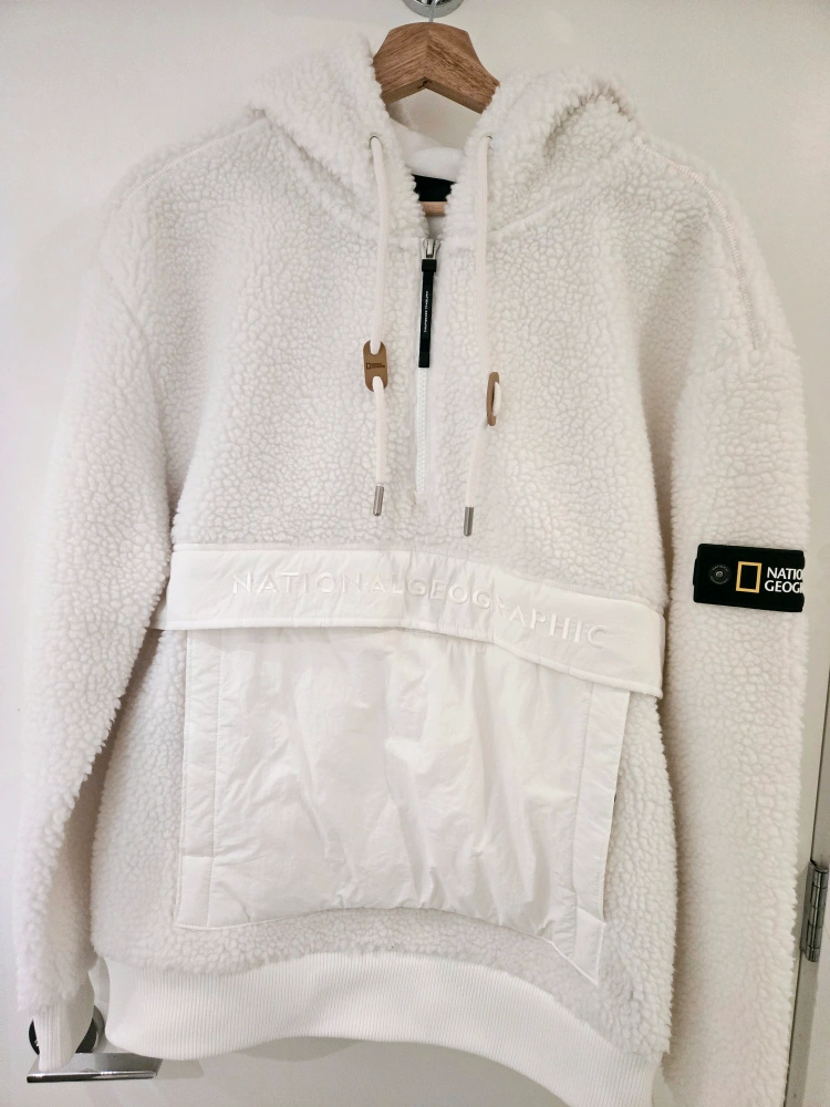 Men's pullover, size medium. White sherpa fleece. Half zip. Kangaroo pocket. National Geographic branding throughout.