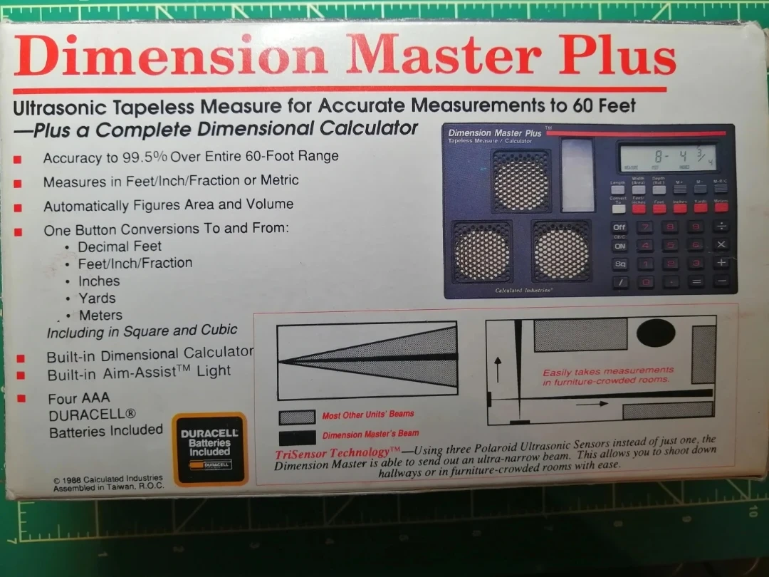 Ultrasonic tapeless measure. Accurate measurements to 60 feet. Includes dimensional calculator and aiming light. Features TriSensor technology for an ultra-narrow beam. Measures in feet/inches/fraction or metric. One-button conversions. Built-in square and cubic calculations. Four AAA Duracell batteries included.