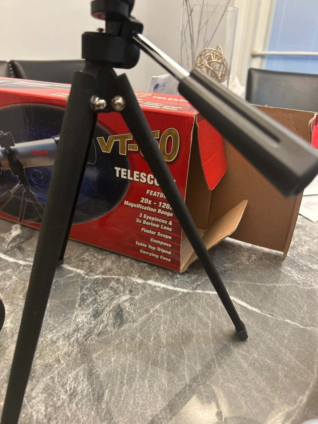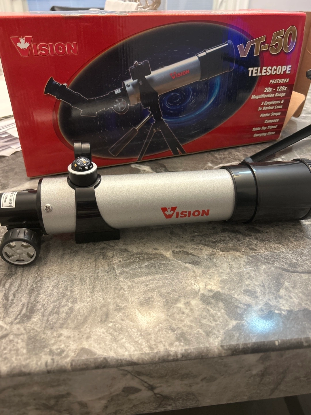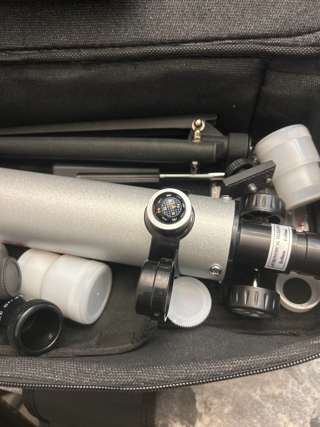 414Refracting telescope. Includes 3 eyepieces, finder scope, compass, table-top tripod, and carrying case. Magnification range 20x - 120x.