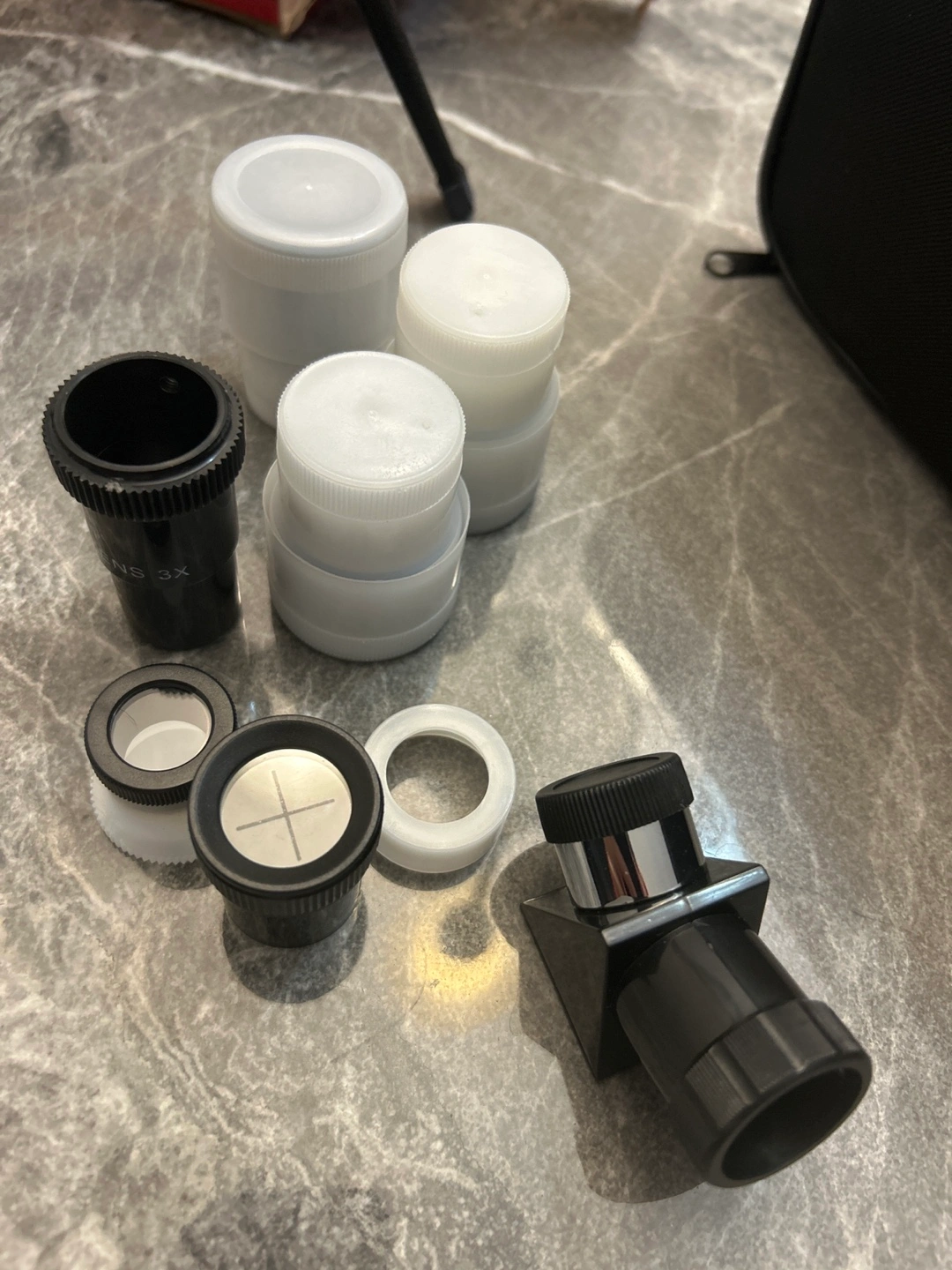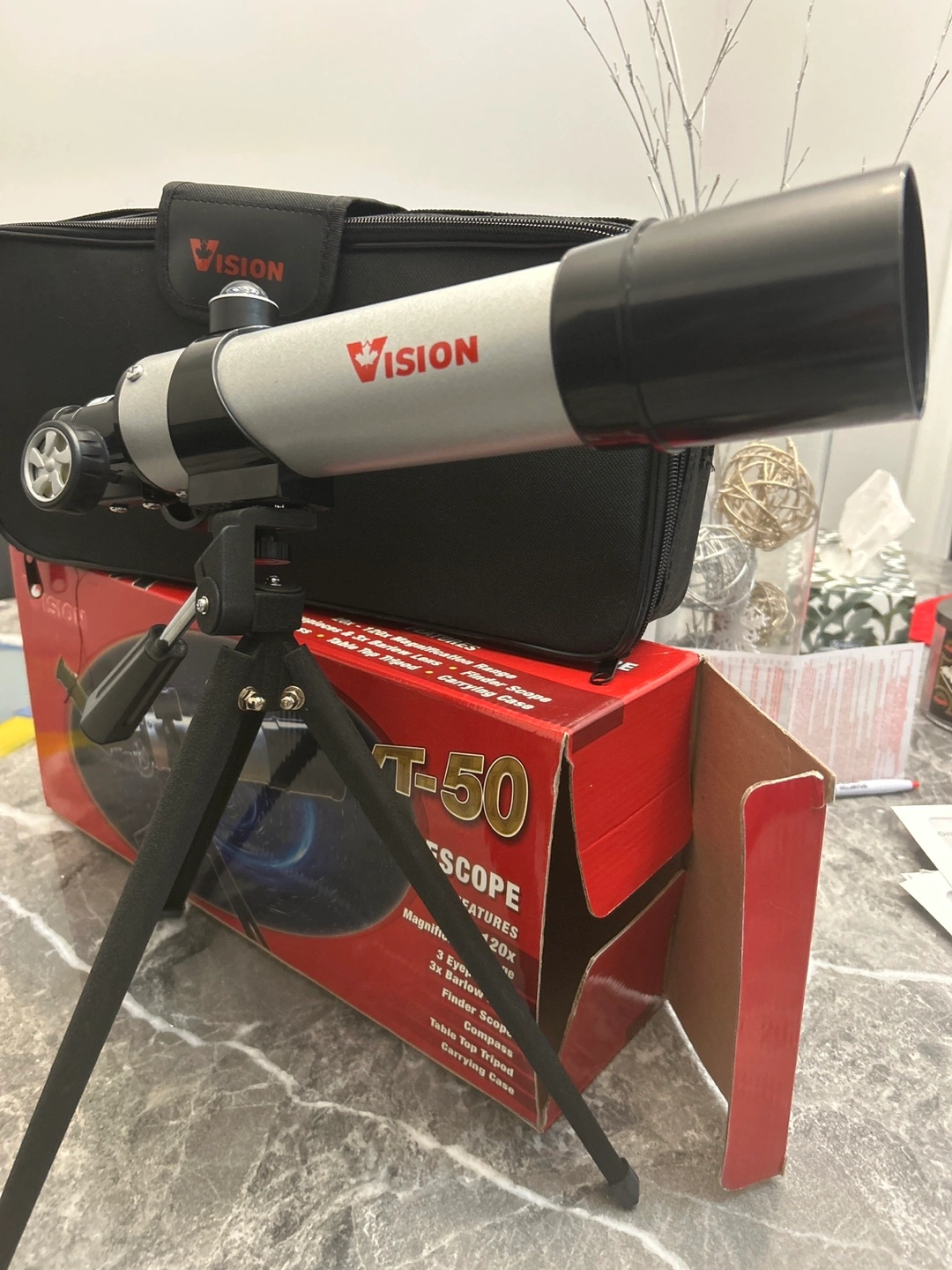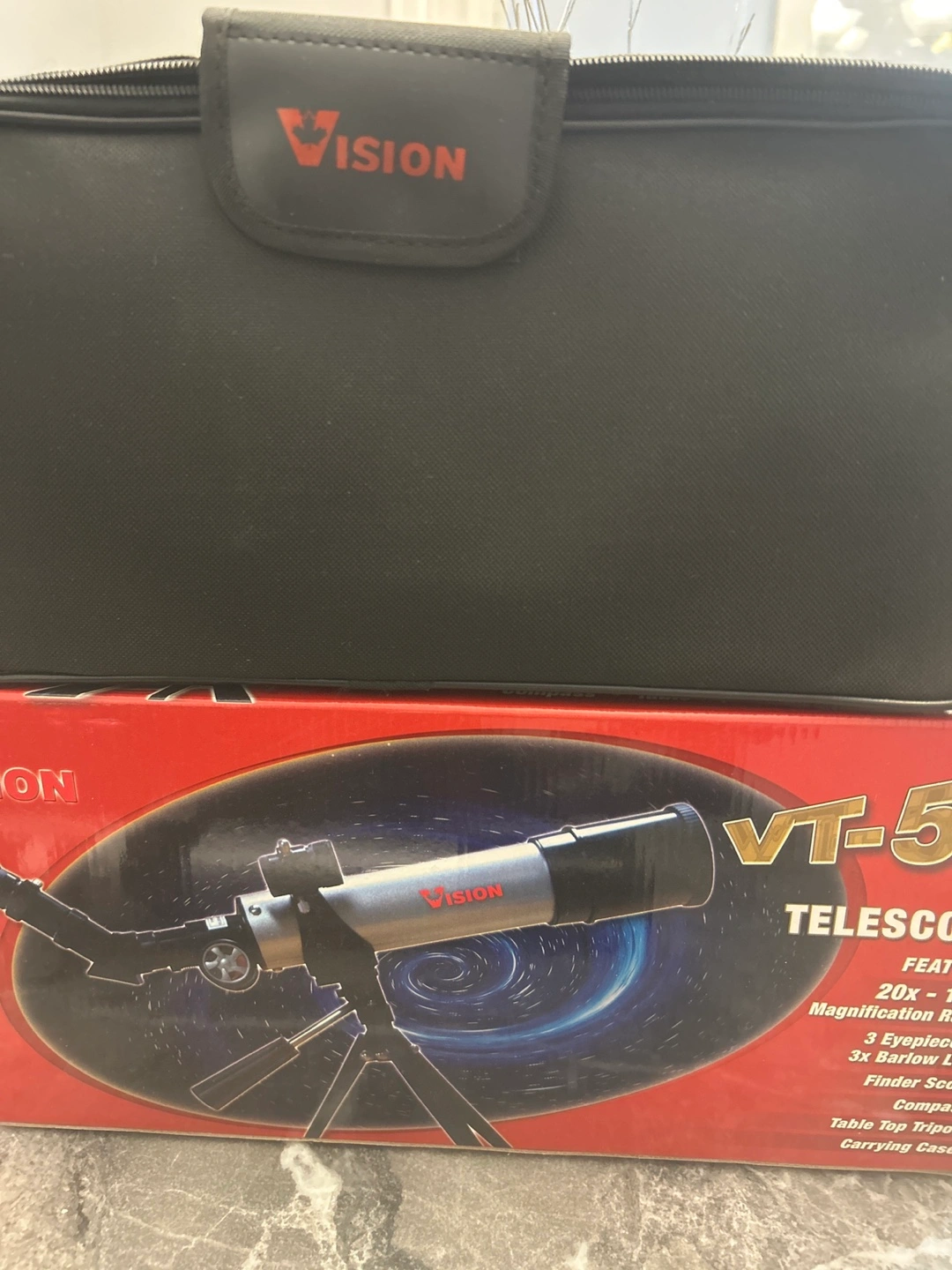 414Refracting telescope. Includes 3 eyepieces, finder scope, compass, table-top tripod, and carrying case. Magnification range 20x - 120x.