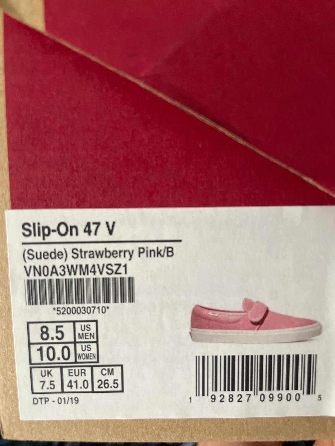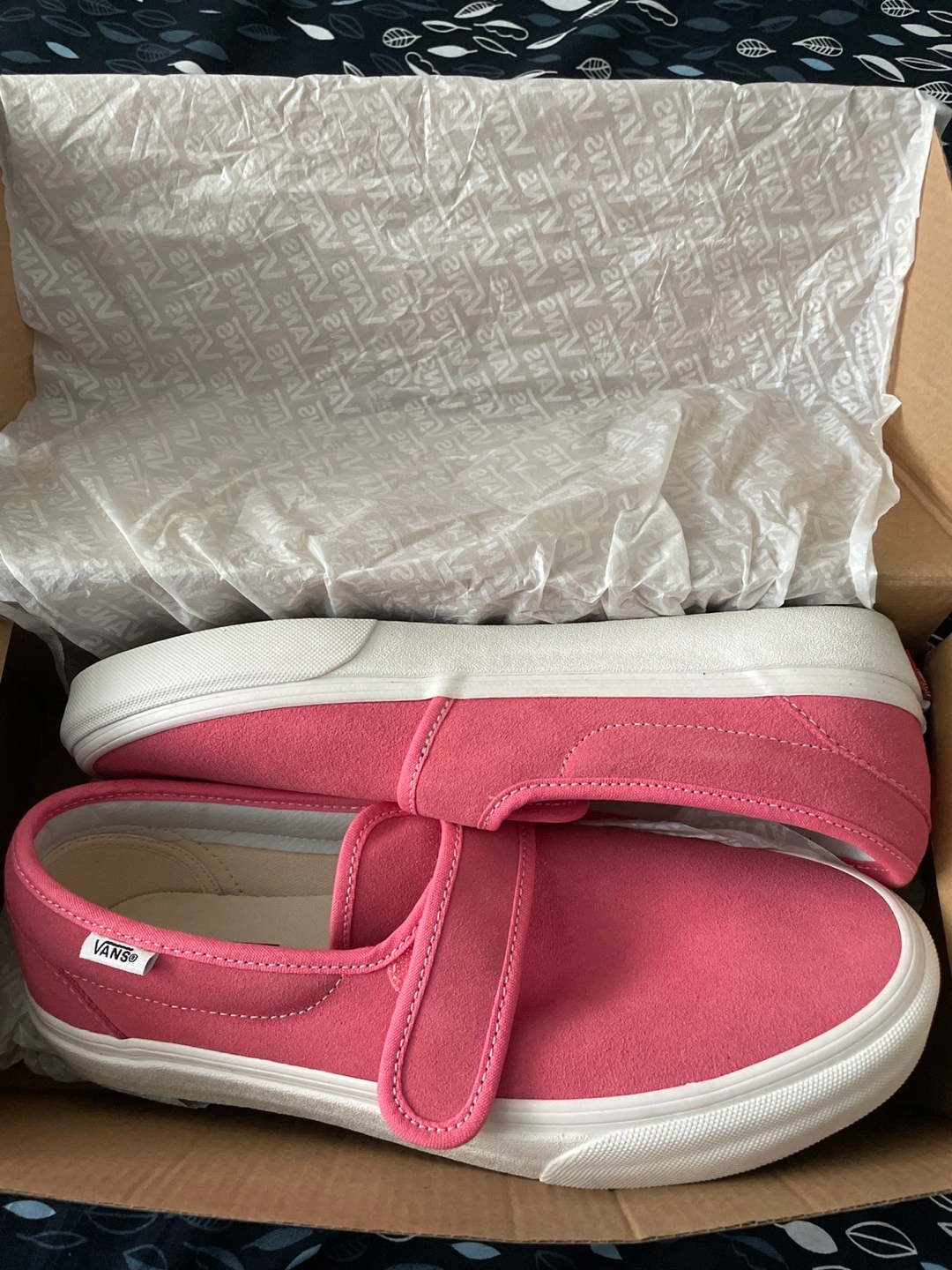 New Vans Slip-On 47 V shoes. Strawberry Pink suede. Women's size 8.5. Velcro strap closure. Comes in original box.