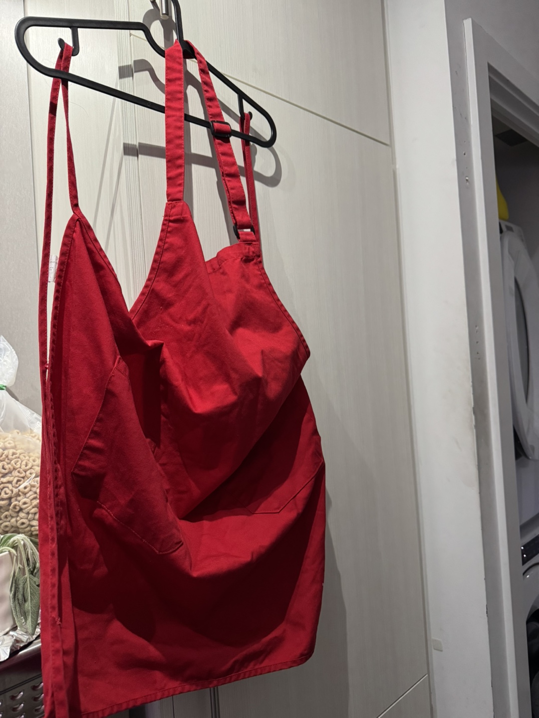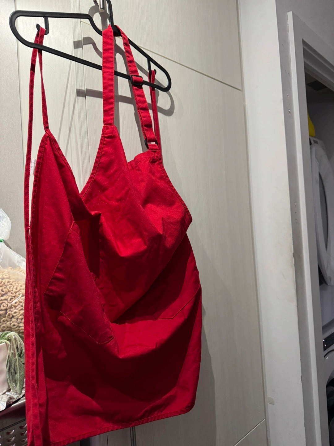 Red apron. Features two pockets. Good condition. Neck and waist straps. Previously owned. Used it for a Halloween costume. Pickup church and Carlton