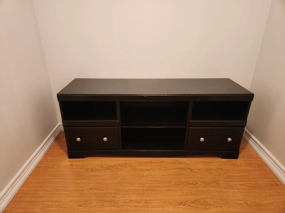 Black entertainment centre. Two drawers. Open shelving. Good condition. Perfect for living room or bedroom. No major scratches or damage.