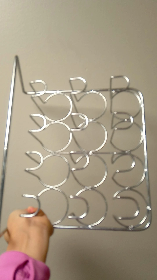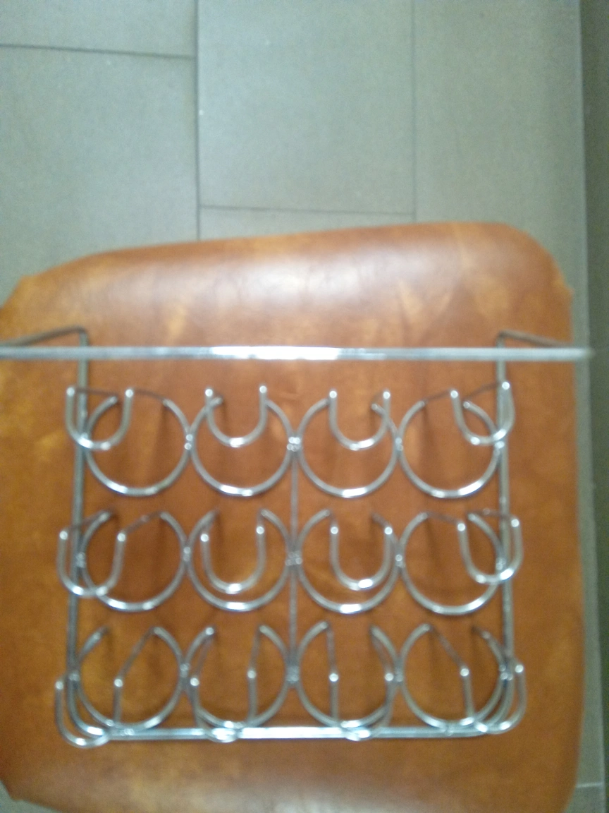 Under-cabinet mug rack. Holds twelve mugs. Chrome metal. Great for kitchens or pantries.