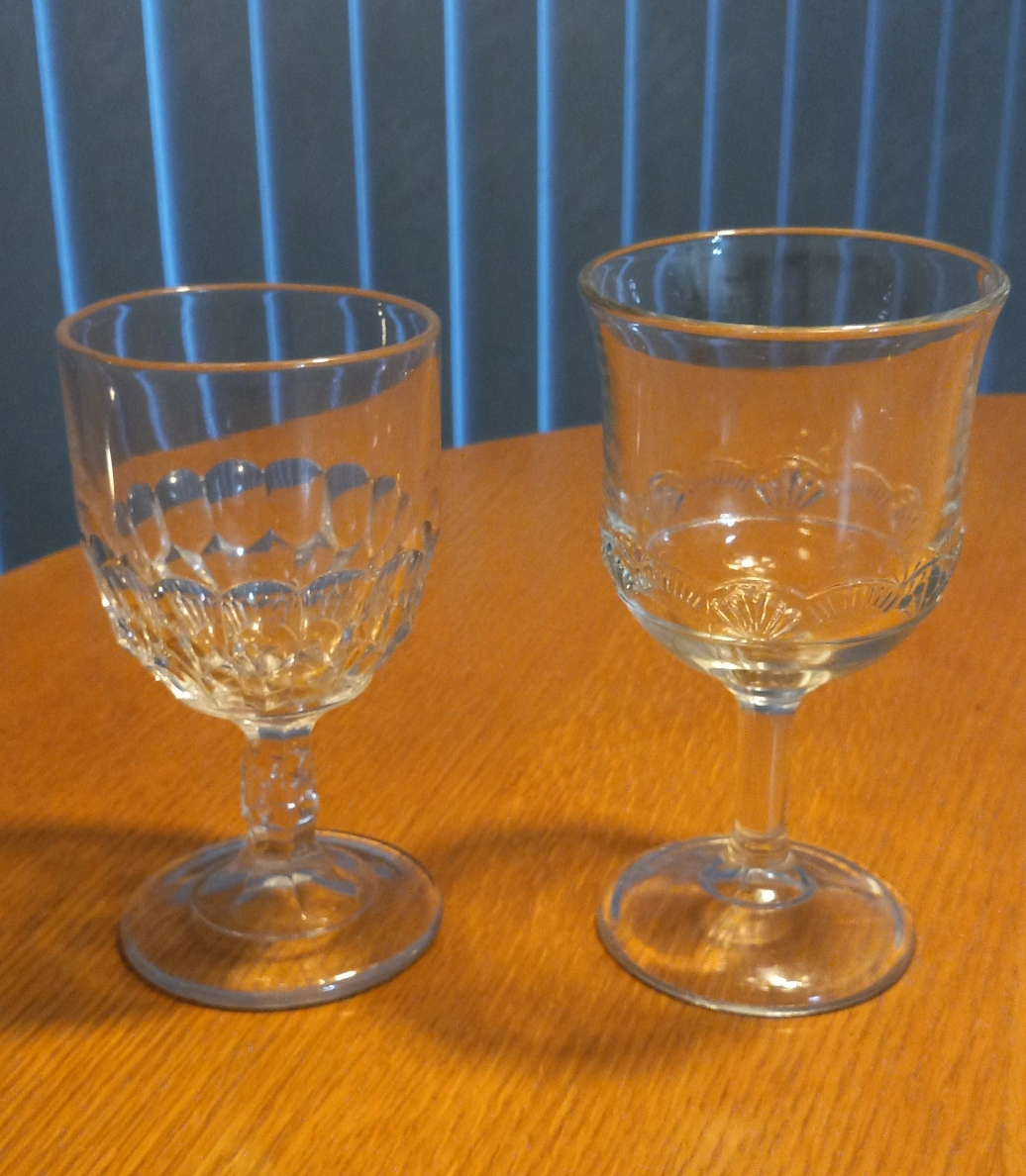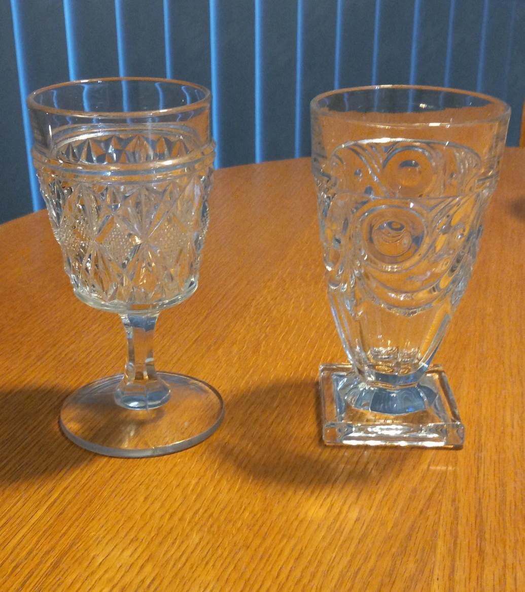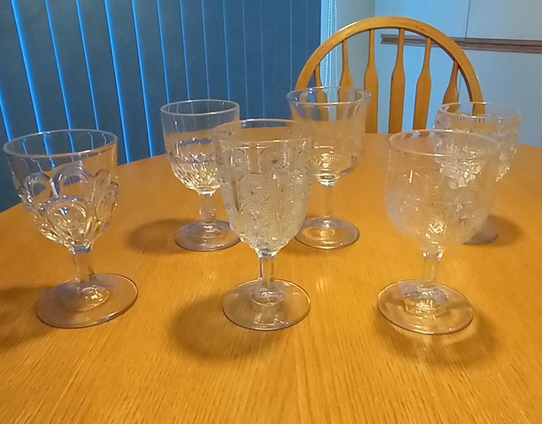 29REDUCED 10 1940s depression glass water goblets, various patterns and heights, no chips or cracks, sell as lot only for $25