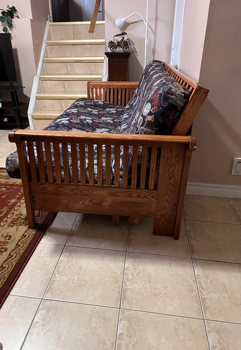 Solid wood futon frame. Dark brown stained finish. Features vertical slats on the back and arms. Includes patterned futon mattress. Comfortable and stylish.