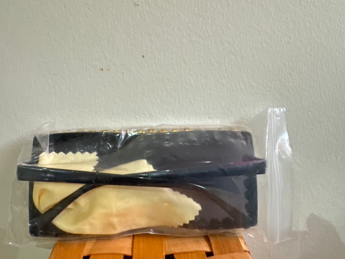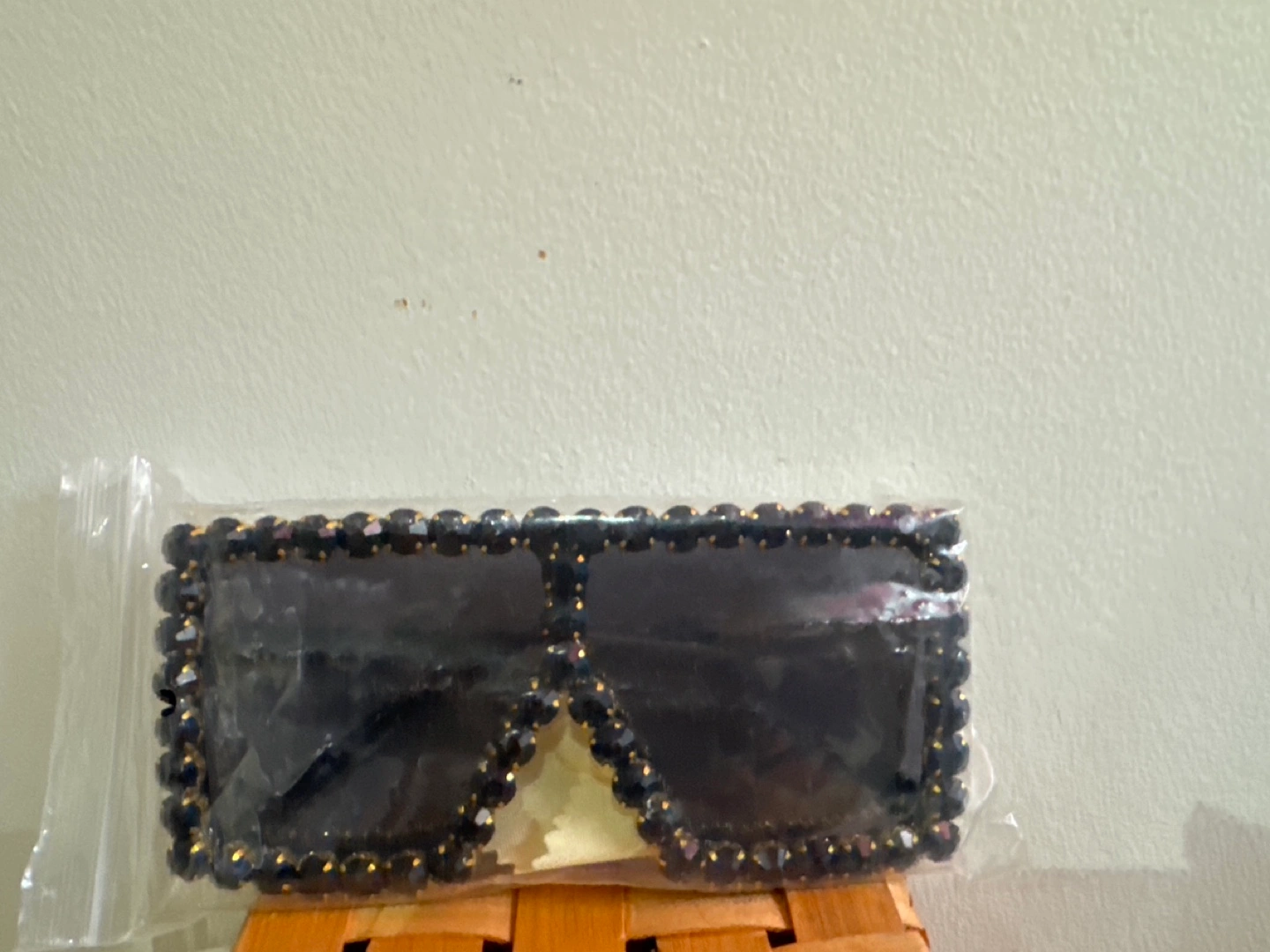 New, never worn sunglasses. Black frame with dark lenses. Rhinestone accents. Comes with a cleaning cloth. Packaged in a clear plastic bag.