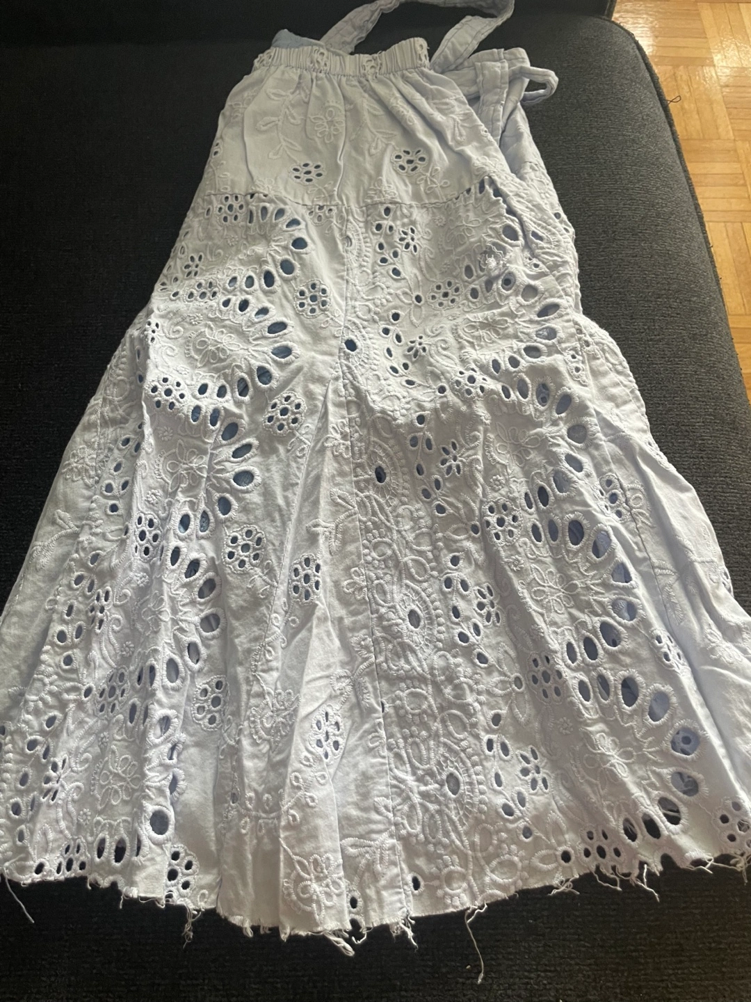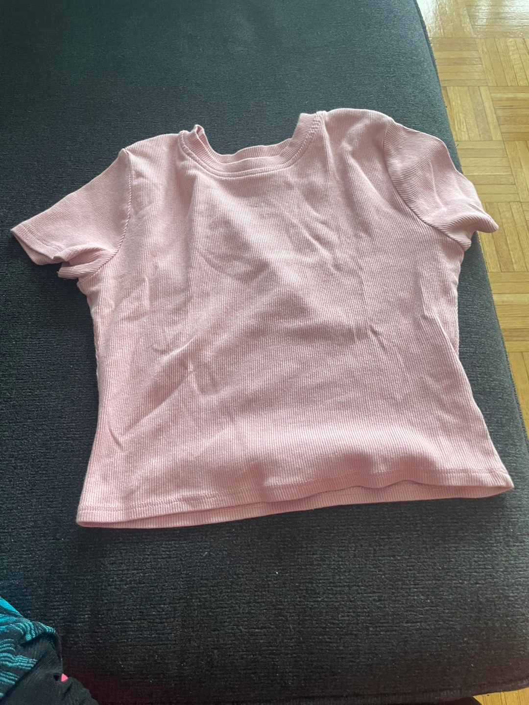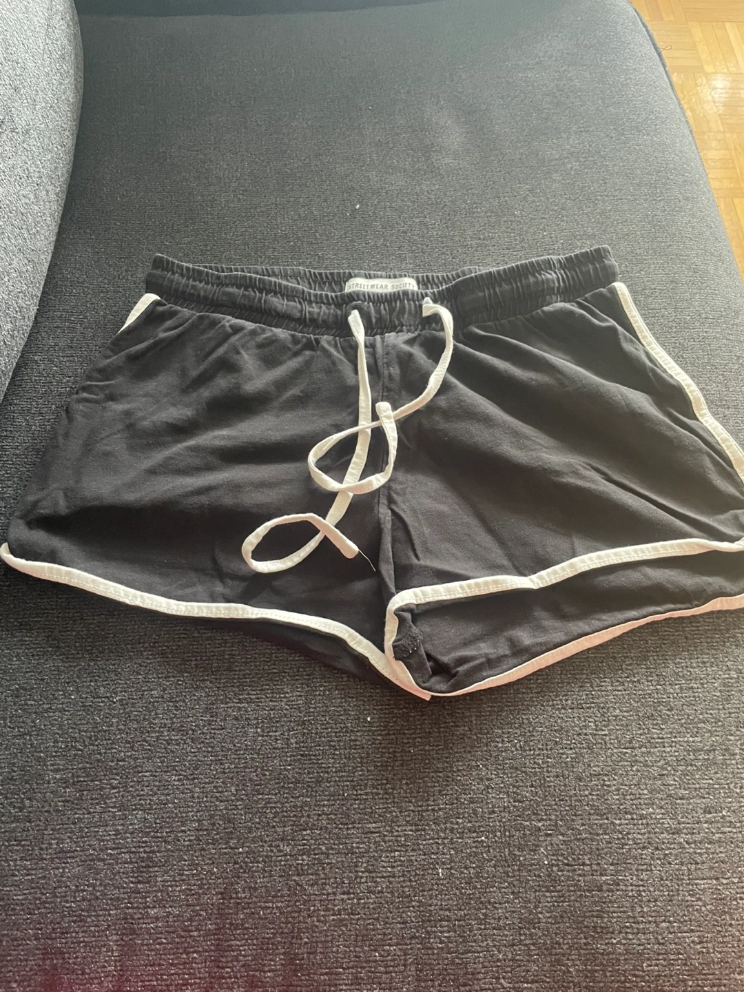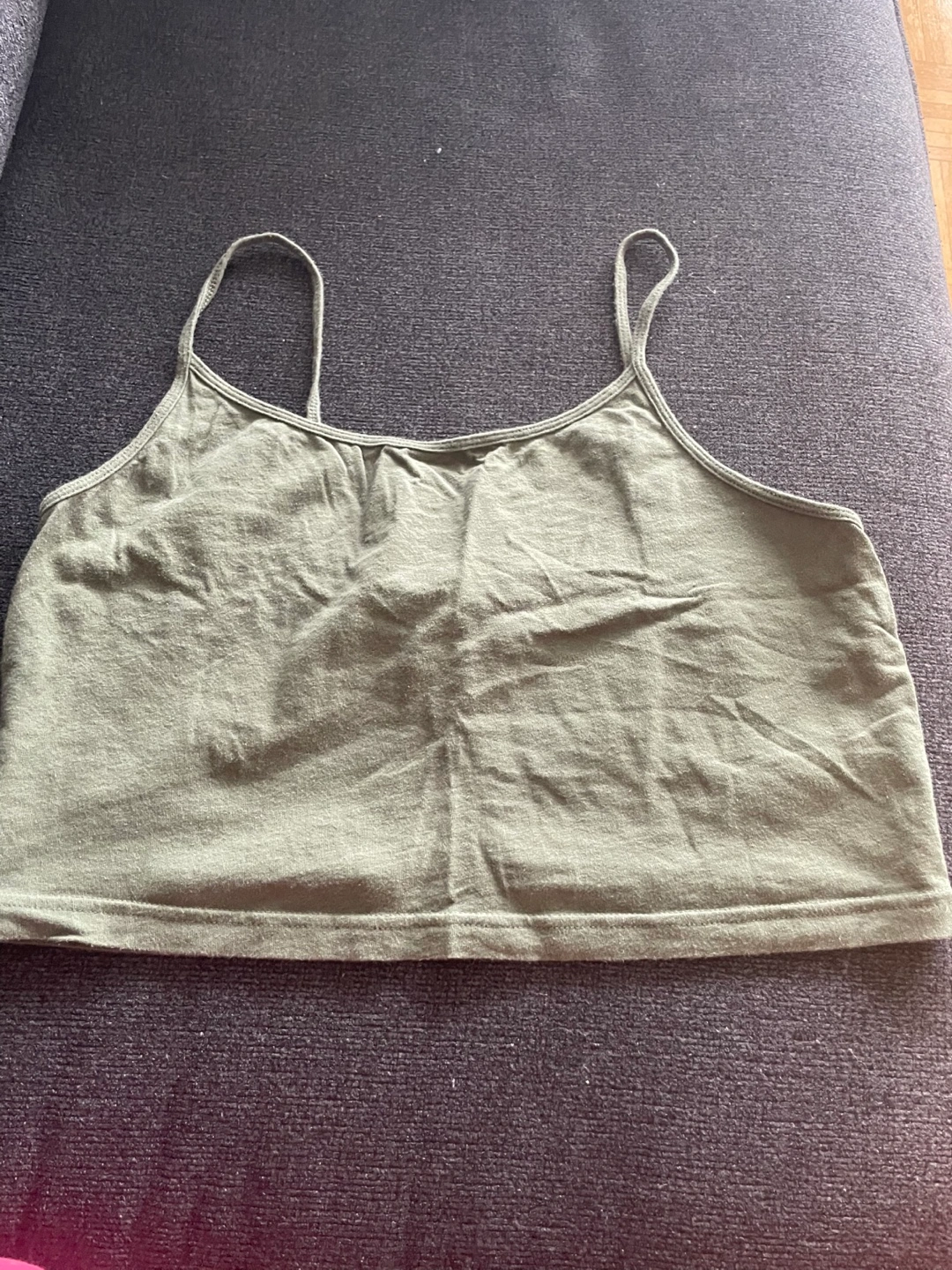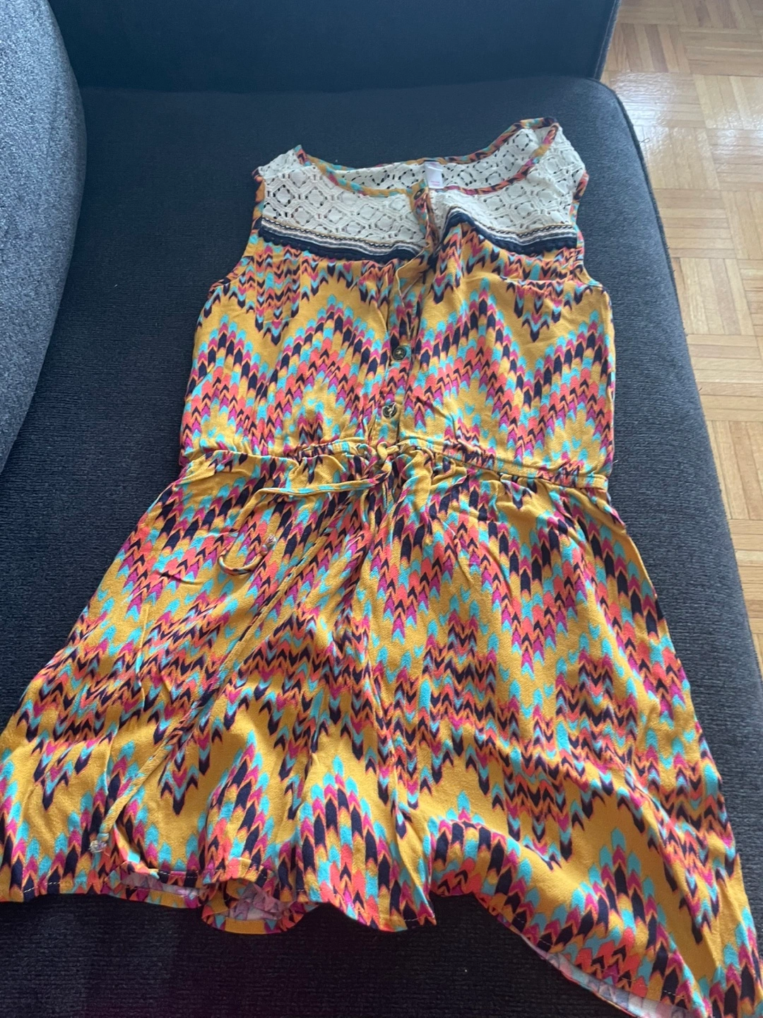 Bundle includes a sleeveless black and teal feather print dress with beaded neckline, black shorts with white side stripes, a pale pink ribbed short-sleeved top, and an olive green cropped tank top. Various sizes.