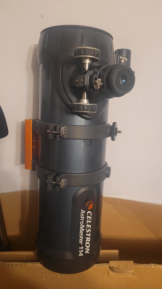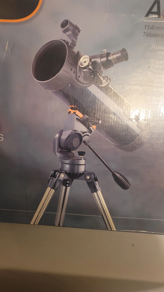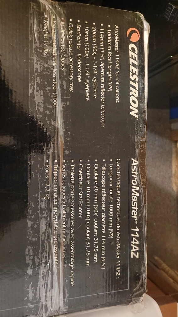 17Reflector telescope. 114mm aperture. Includes tripod and eyepieces. Good for beginners.