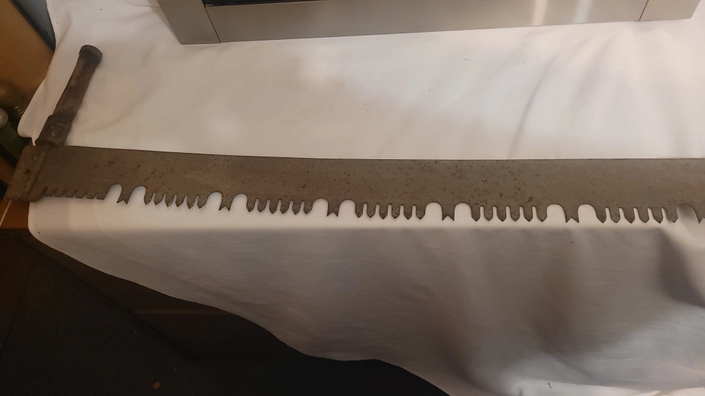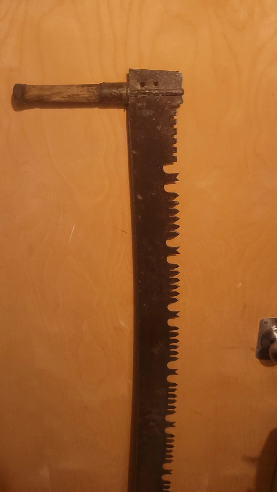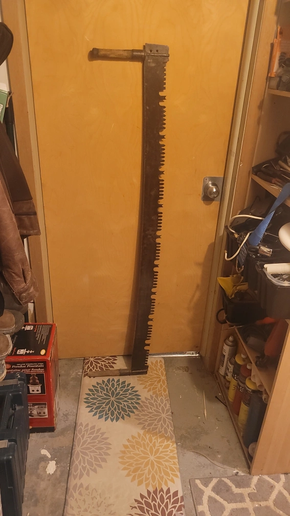 Large antique crosscut saw. Wooden handle. Shows signs of age and use. Great for display or restoration.