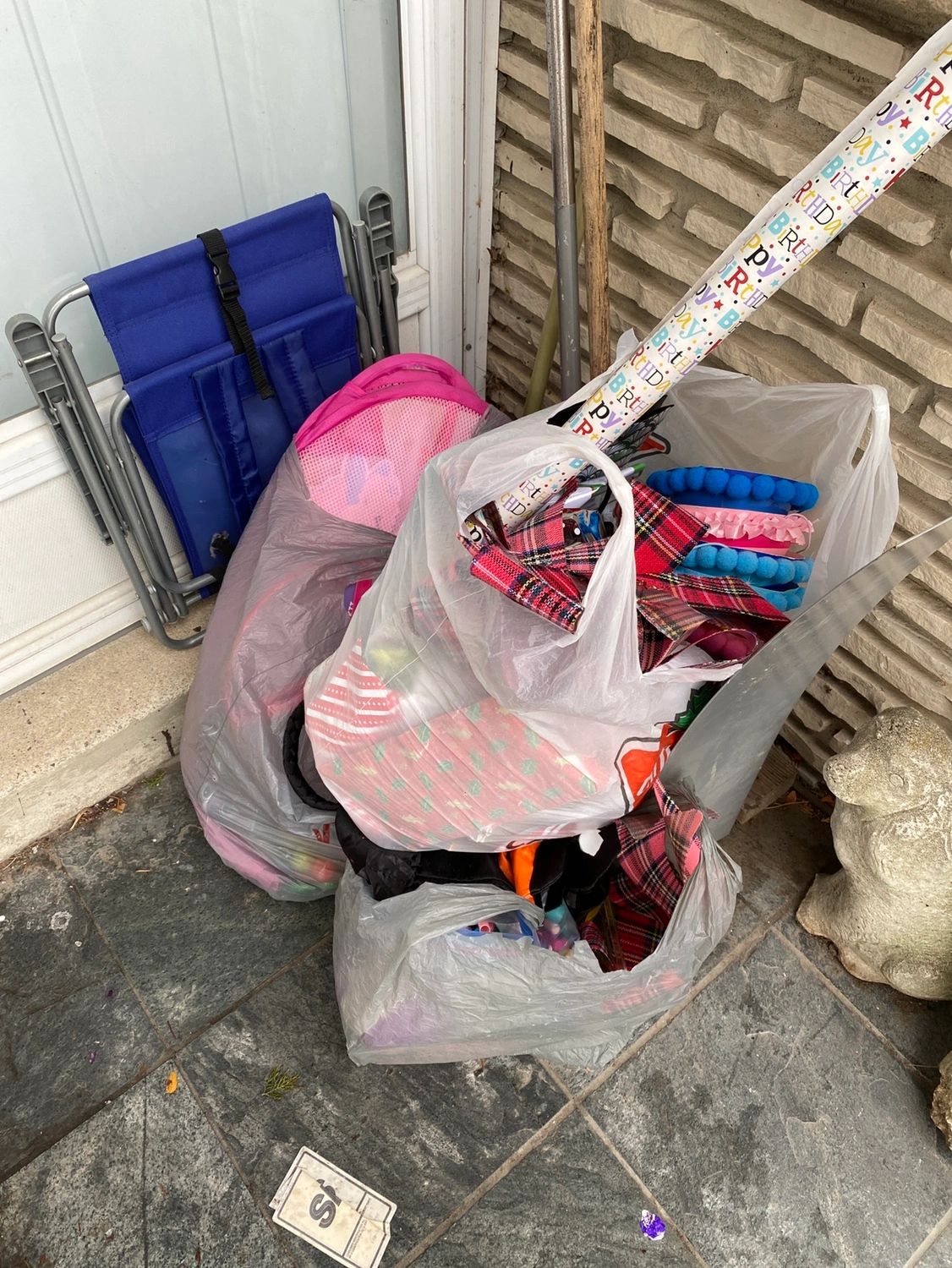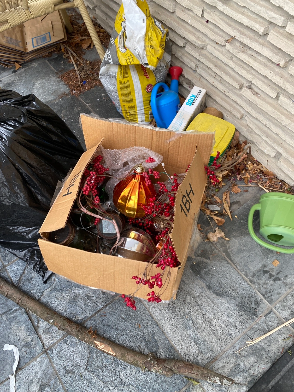 Large cardboard box filled with various items. Includes Christmas ornaments, berry sprigs, and other miscellaneous decorations. Also includes other items, toys and clothing. Take what you want