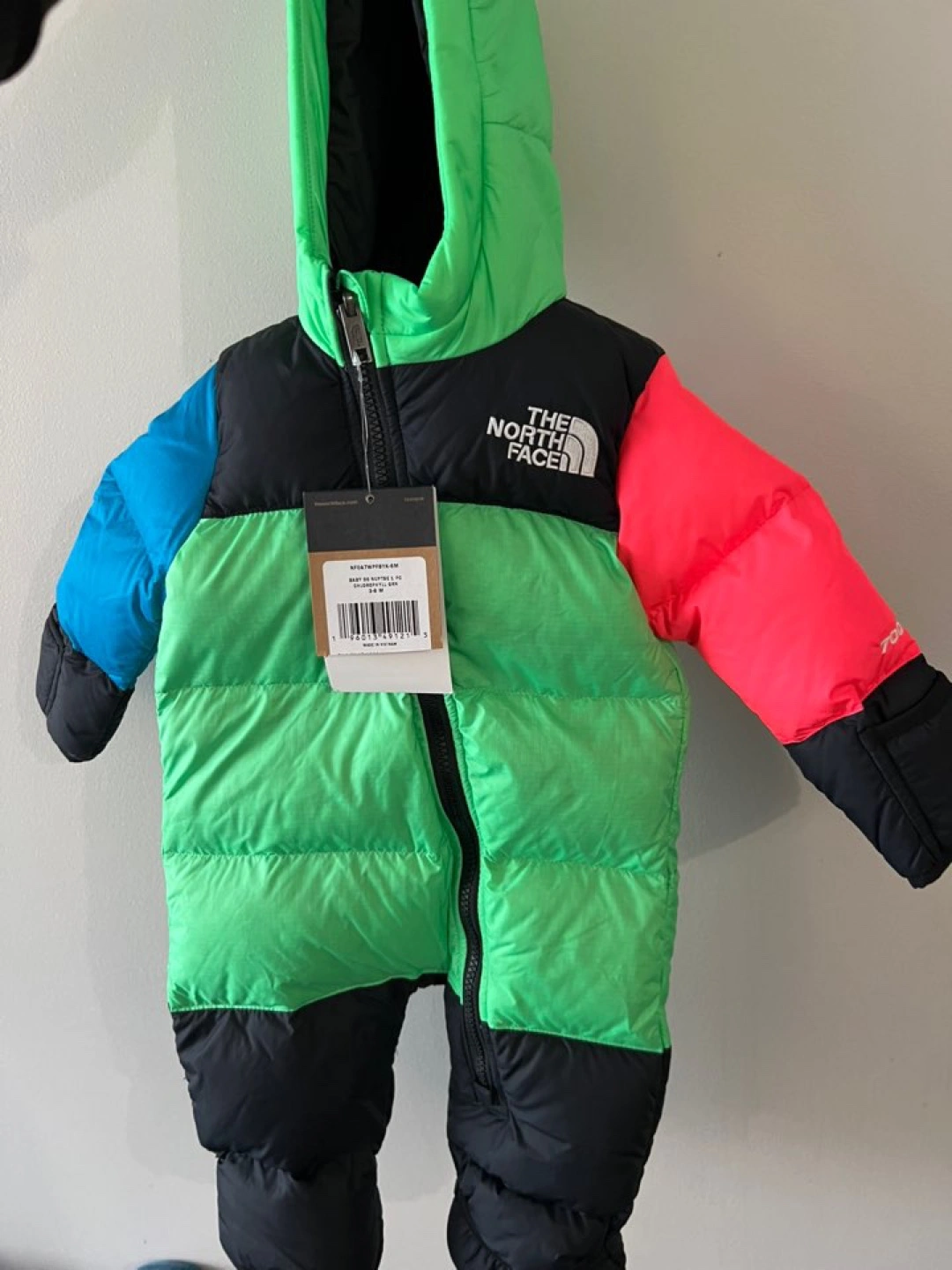 Adorable baby snowsuit. Colour-blocked design. Features a hood and zip closure. Excellent for winter weather. Never used it