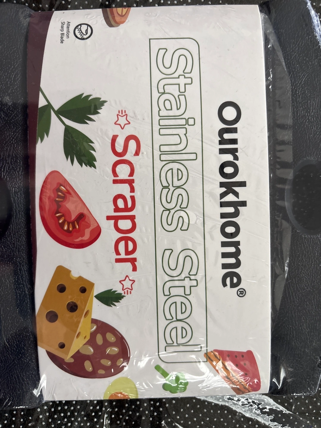 New stainless steel scraper. Black plastic handle. Features a sharp blade. Ideal for baking and cooking.2pc.