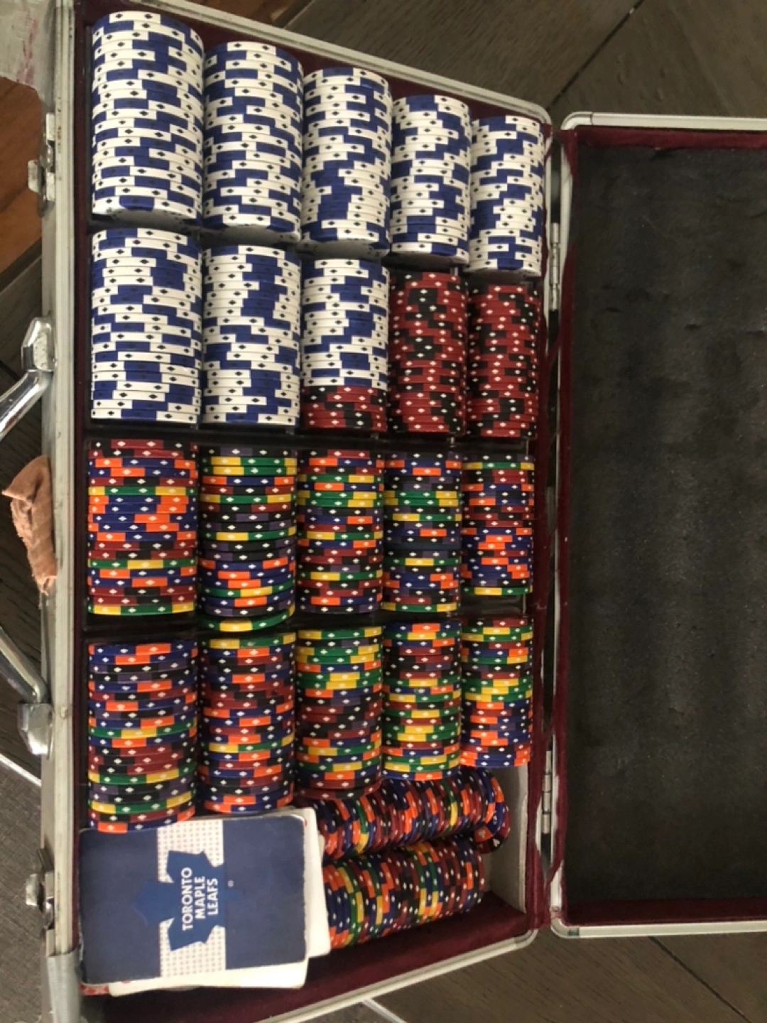 Large set of poker chips in an aluminum carrying case. Variety of colours and designs. Includes Toronto Maple Leafs card.