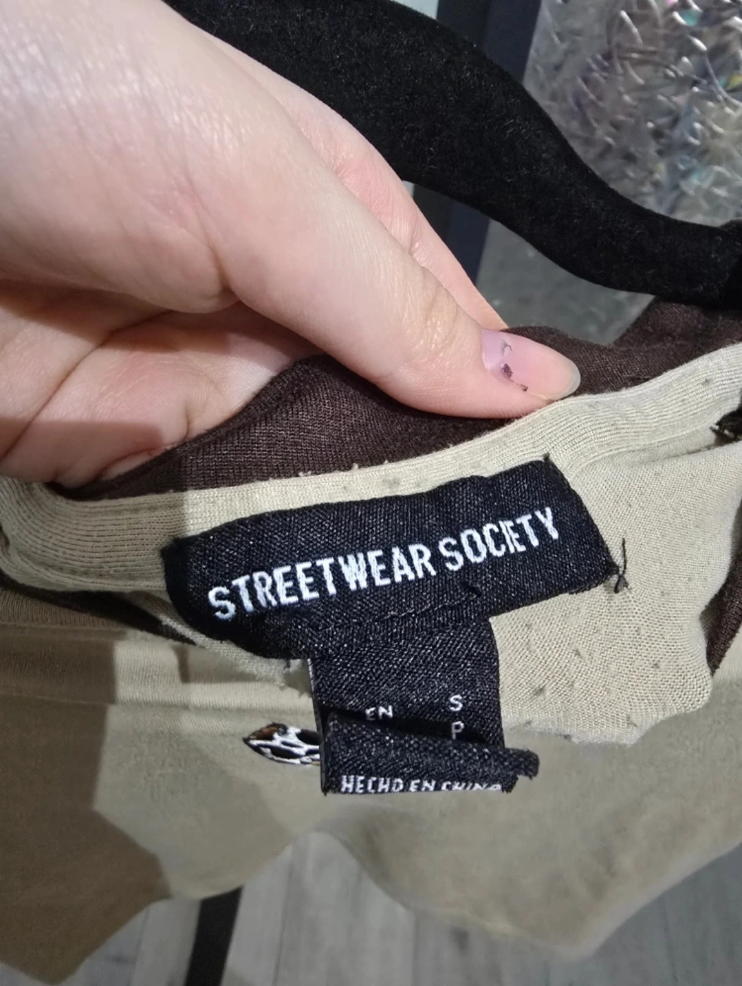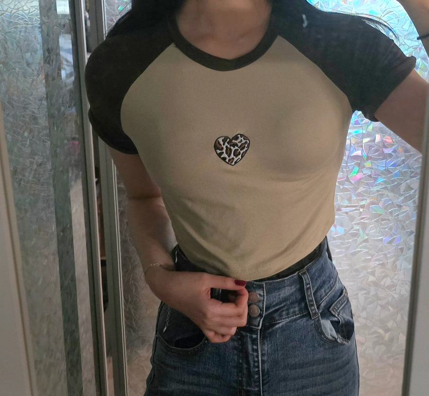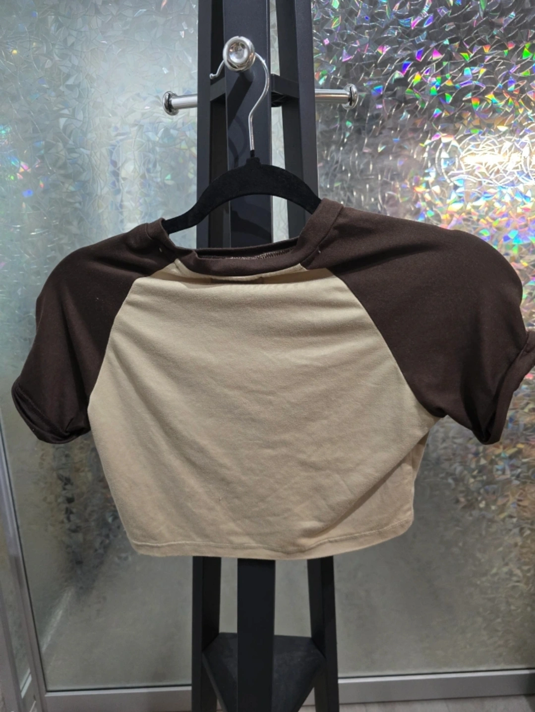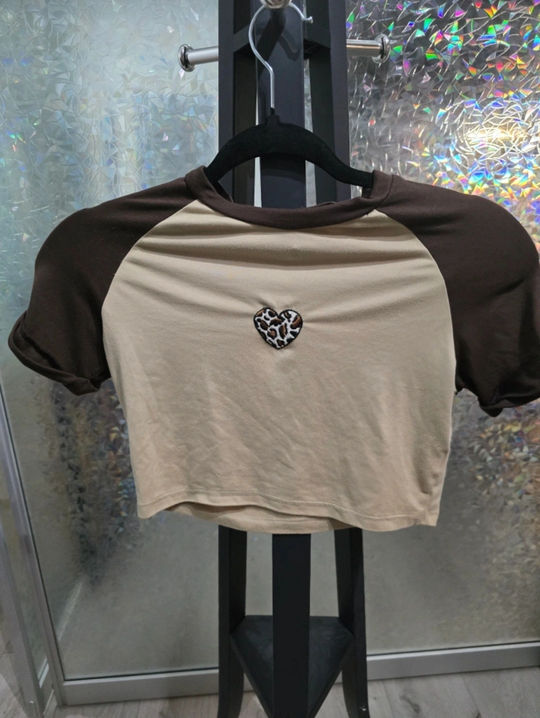 Cute cropped t-shirt. Features a beige body with brown raglan sleeves. Small leopard print heart embroidered on the chest. Size small. Price negotiable & open to trades. Delivery possible to most line 1 and line 2 stations.
