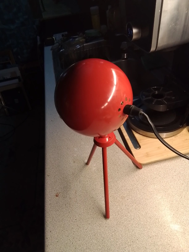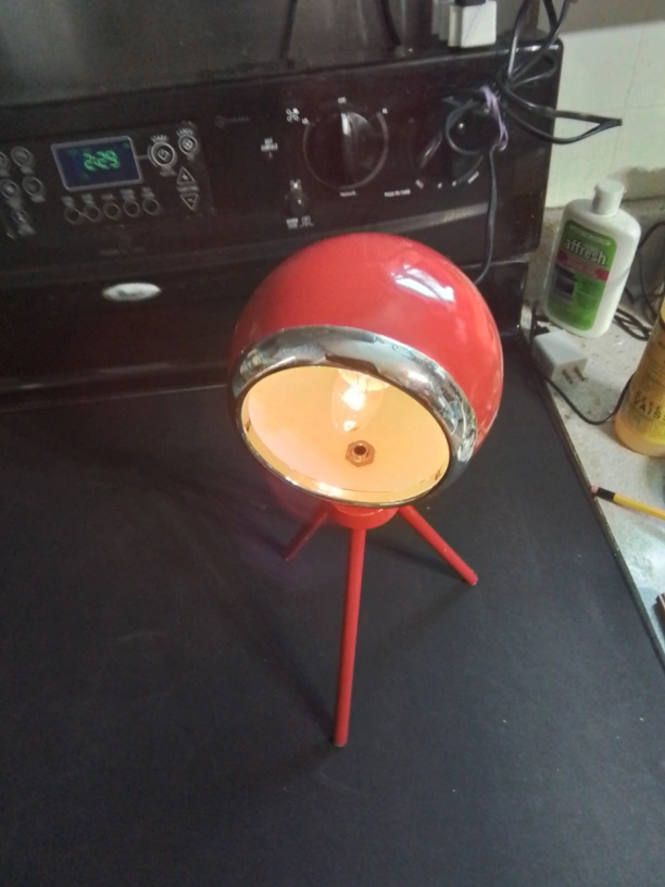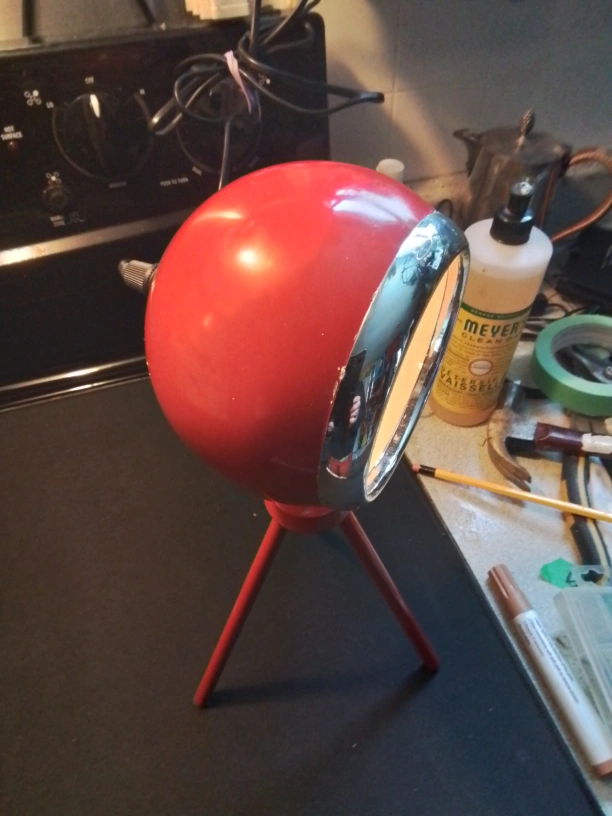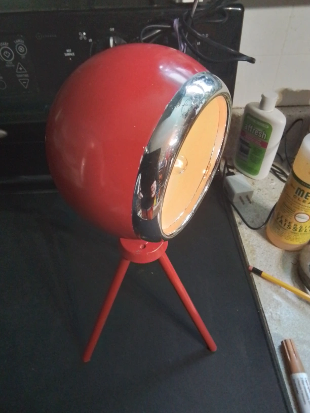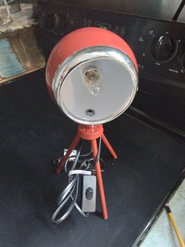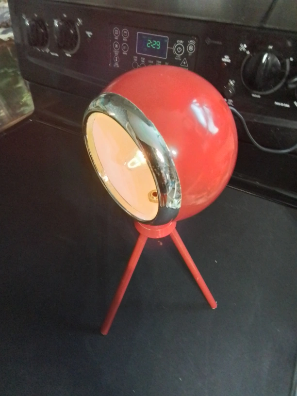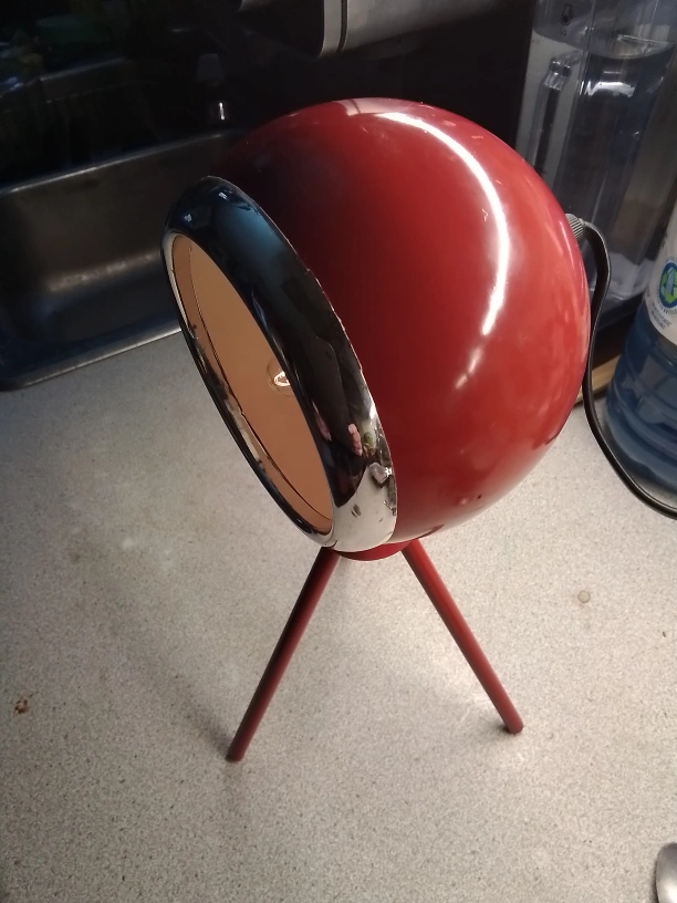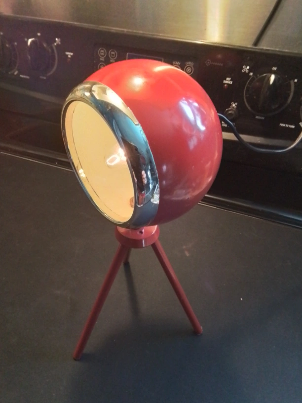 114MCM Red Eye Desk Lamp in Working Condition Red Tripod Table Lamp Unique red table lamp. Features a spherical shade with a chrome accent and a tripod base. In-line on/off switch. Cord included. 12" H. Very good condition. Please See photos for more details. Pickup at Young Street and Steels Ave