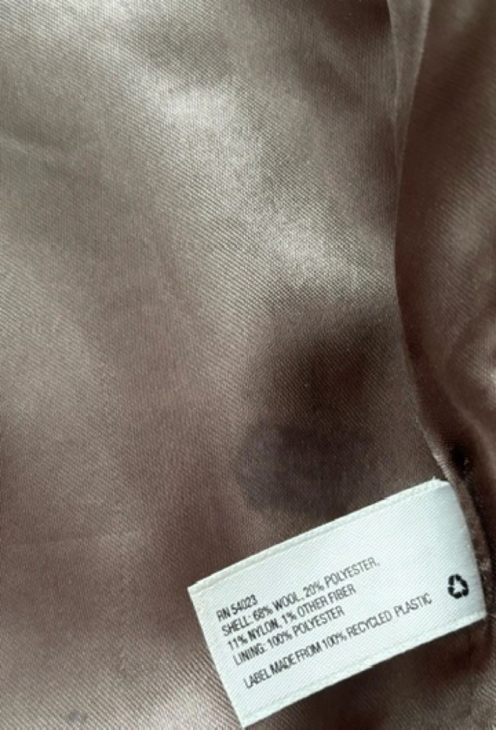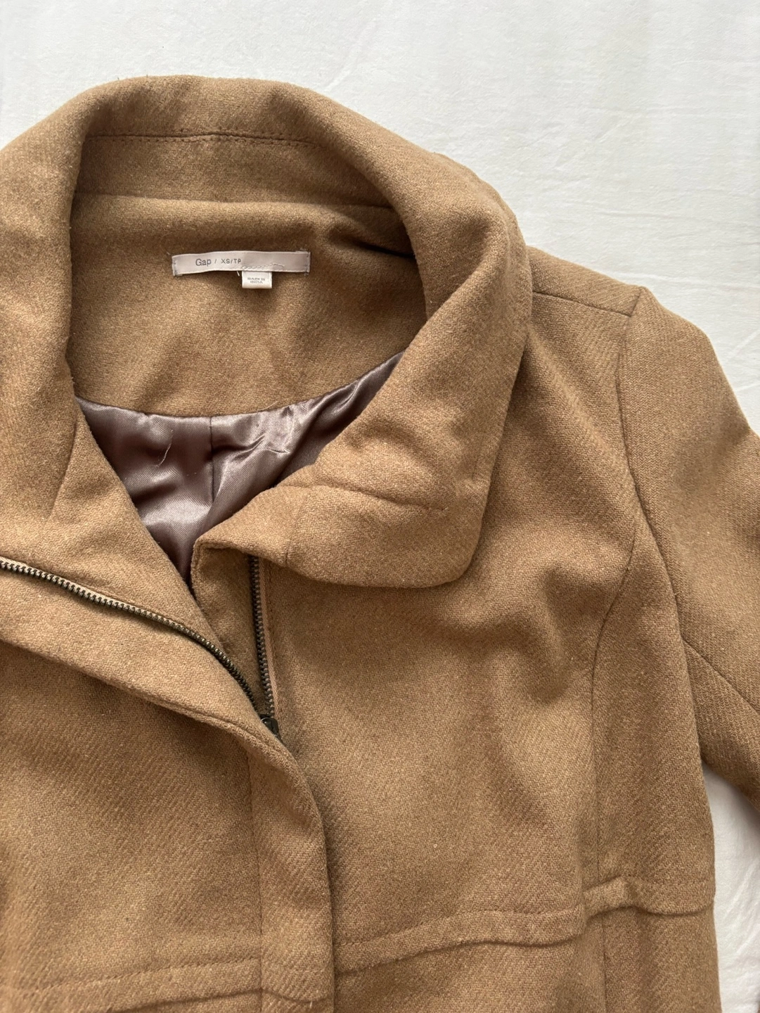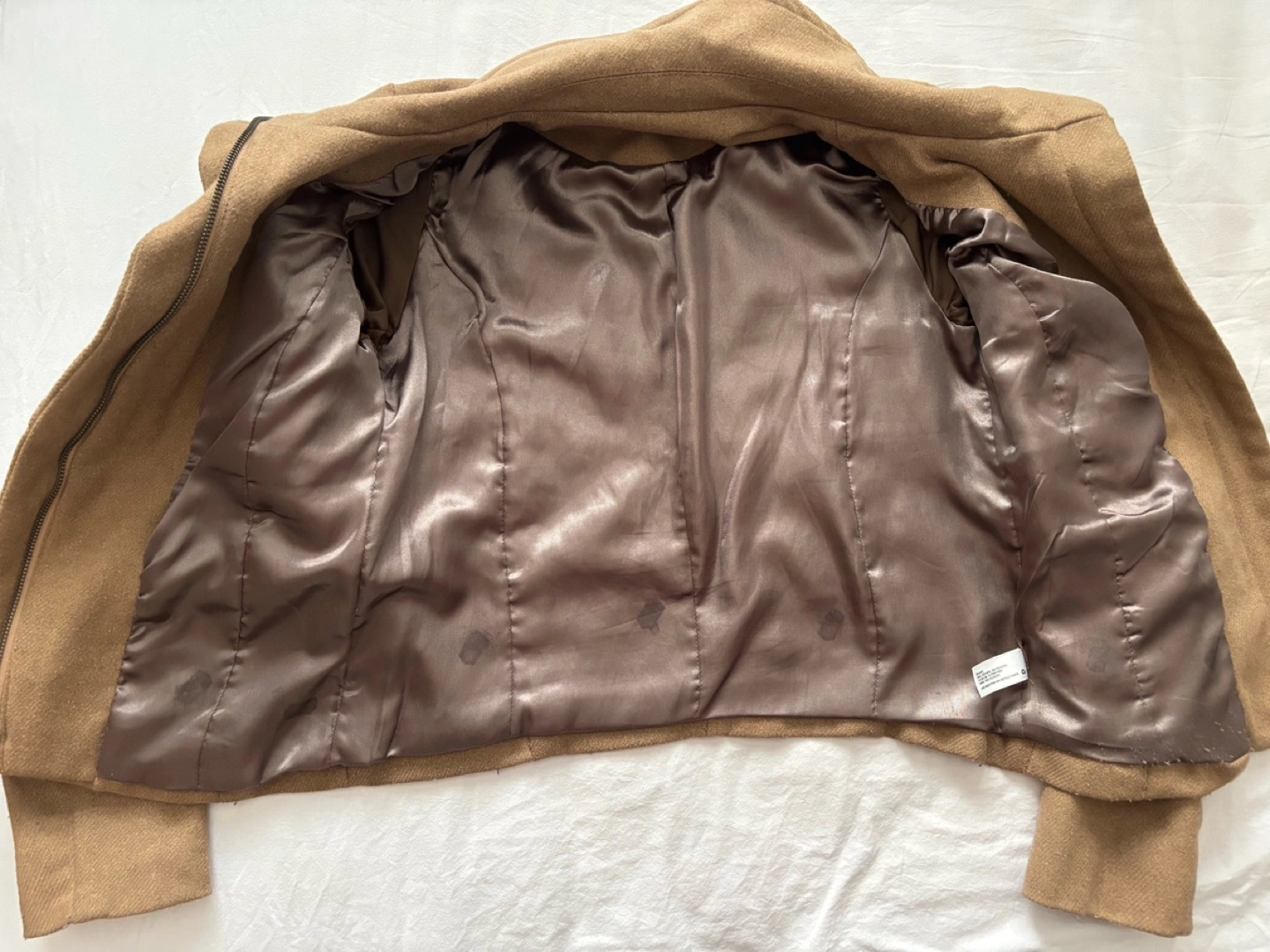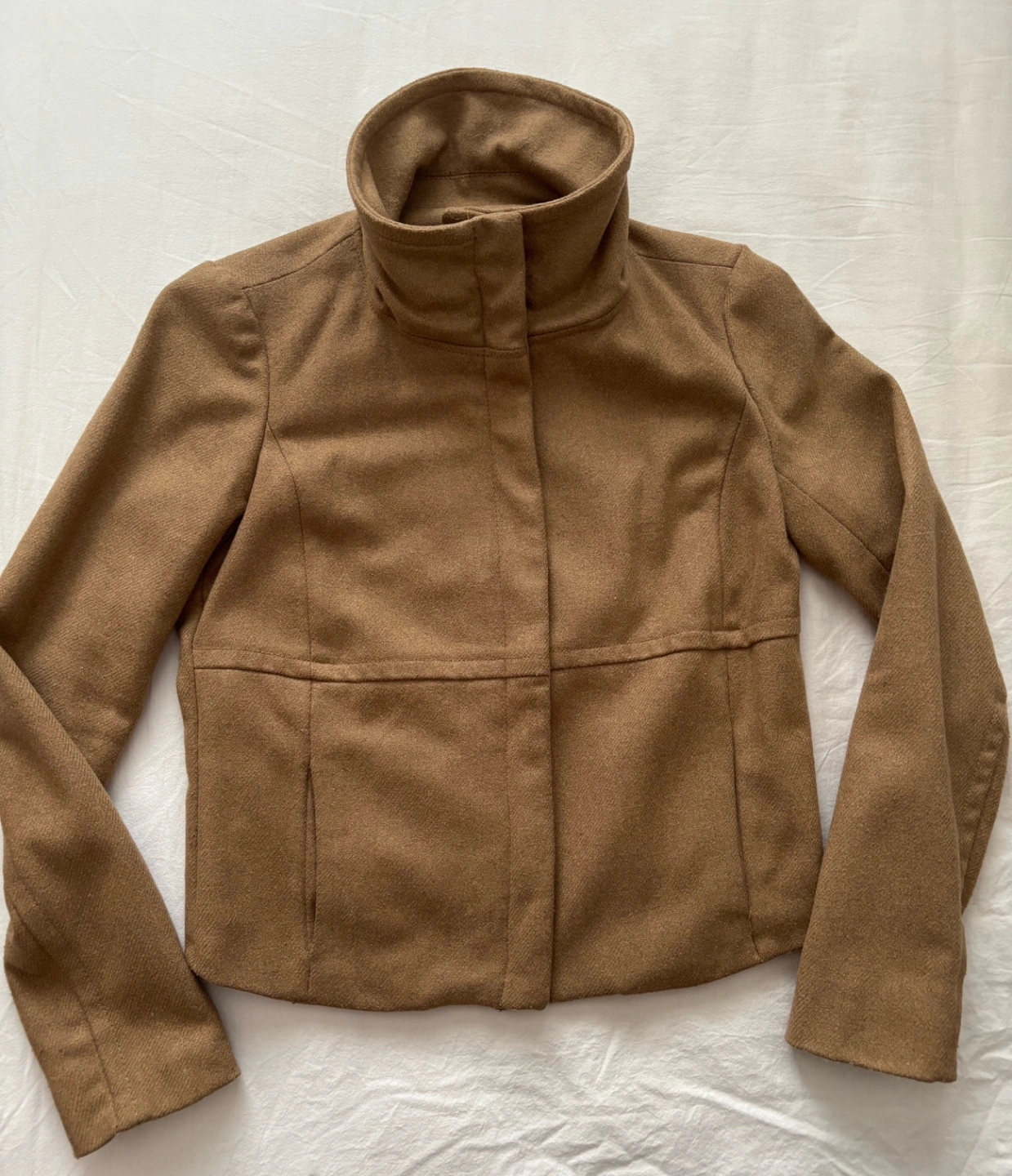 Women's brown wool blend jacket. 68% wool. High collar. Zipper closure. Size small. Fitted. Features a satin lining.