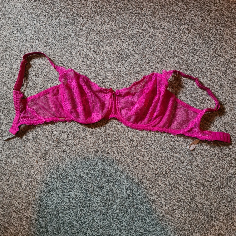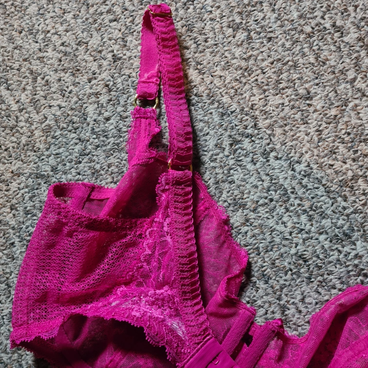 Beautiful hot pink bra. Delicate lace detailing. Adjustable straps. Hook and eye closure.