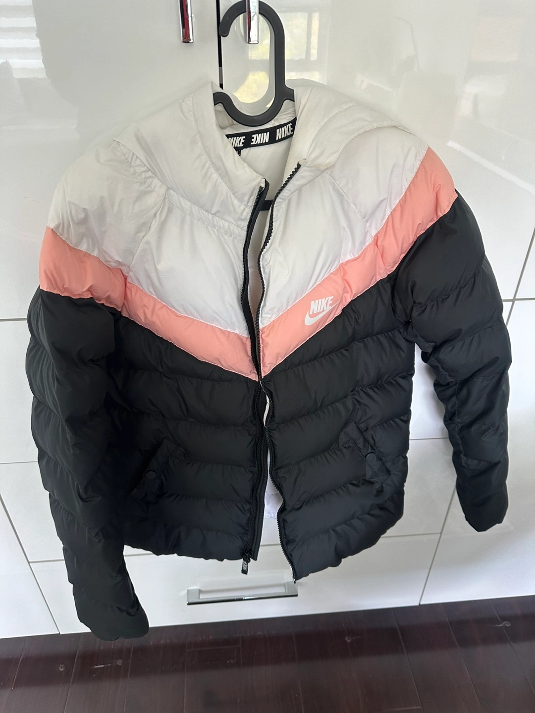 Kids Nike puffer jacket. Black, white and peach colour-block design. Zip closure. Hood. Lightly padded.
