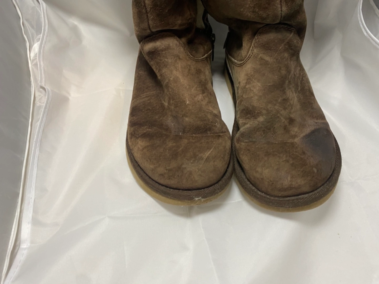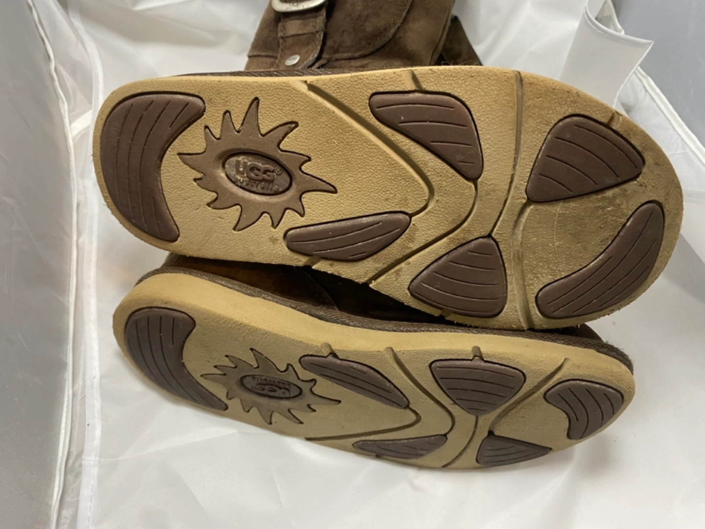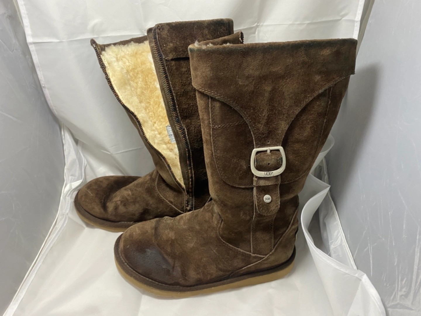 Ugg 5132 Womens Boots in size 7, featuring a classic tall design in brown suede with luxurious sheepskin lining. These winter boots have a round toe shape, zip closure, and a low block heel for comfort. Made from high-quality leather and rubber outsole for durability. Perfect for the winter season, these mid-calf boots are both stylish and practical, suitable for everyday wear. Made by UGG Australia, known for their timeless and iconic designs.