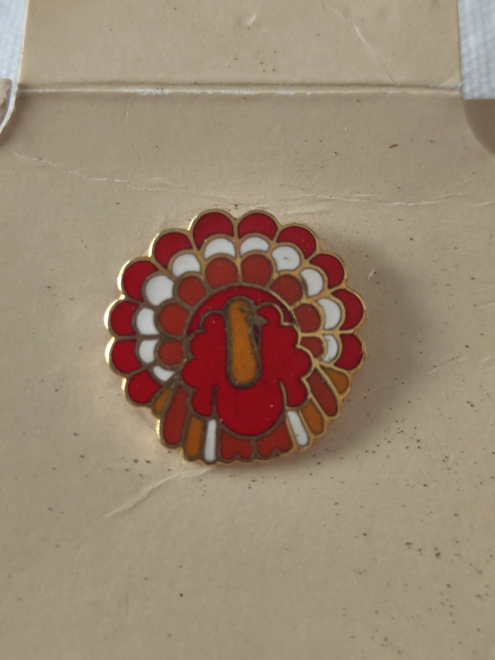 Small, round enamel pin. Features a stylized turkey design. Red, white, and orange colours. Gold-toned metal backing. Never worn.