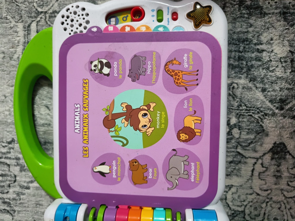 Interactive bilingual learning book. Features 100 words in English and French. Great for early learning. Includes lights and sounds. Pre-owned.