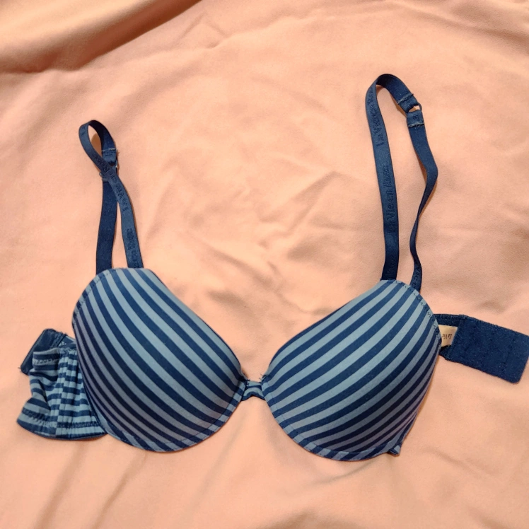 269Lightly used, blue and white striped psh up bra. Features adjustable straps and can convert into a racerback cross back. Soft and comfortable material.