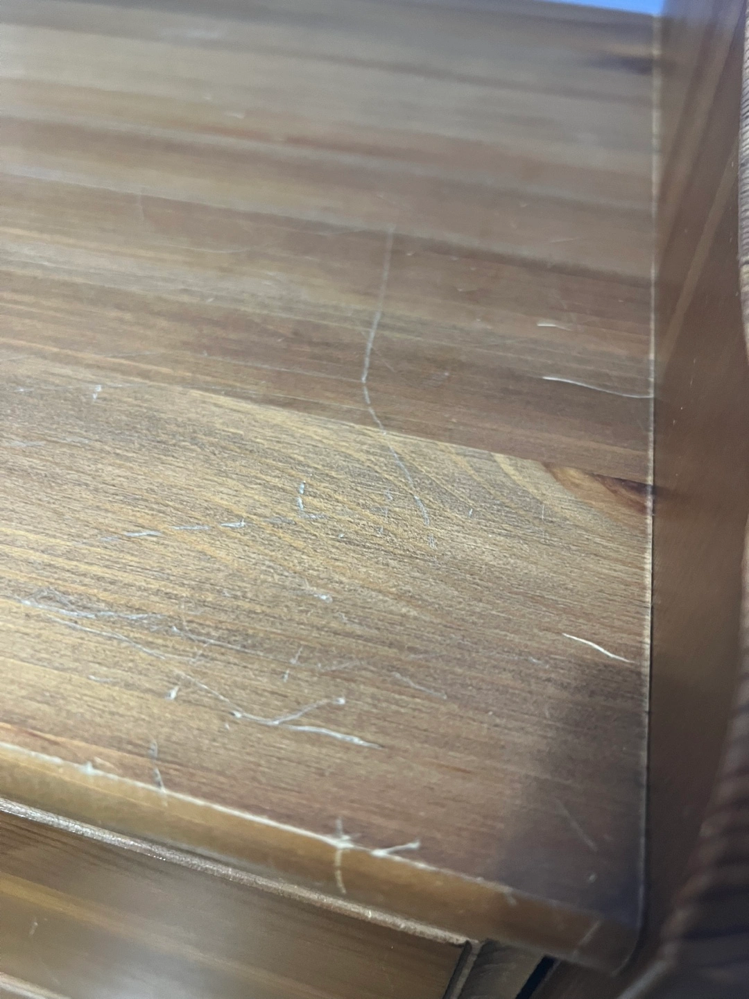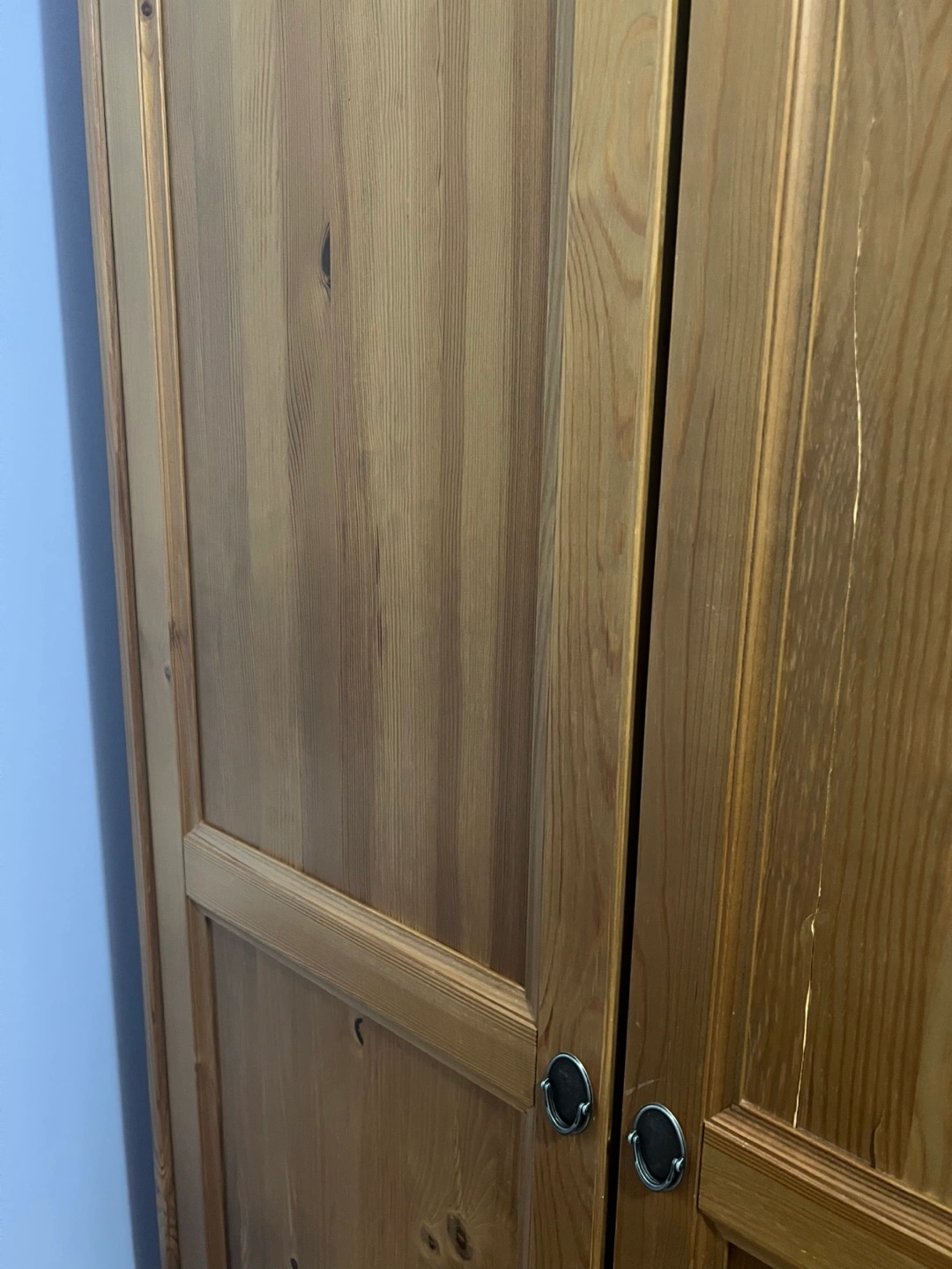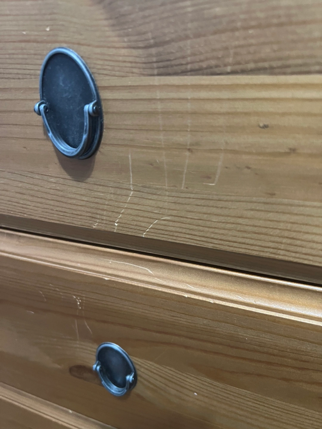 There are visible scratches and wear. See photos for scratches and crack in armoire door (doesn’t affect door use at all) On the Tallboy there are two handles missing on two drawers. The armoire has a bar to hang clothes and a shelf at the top