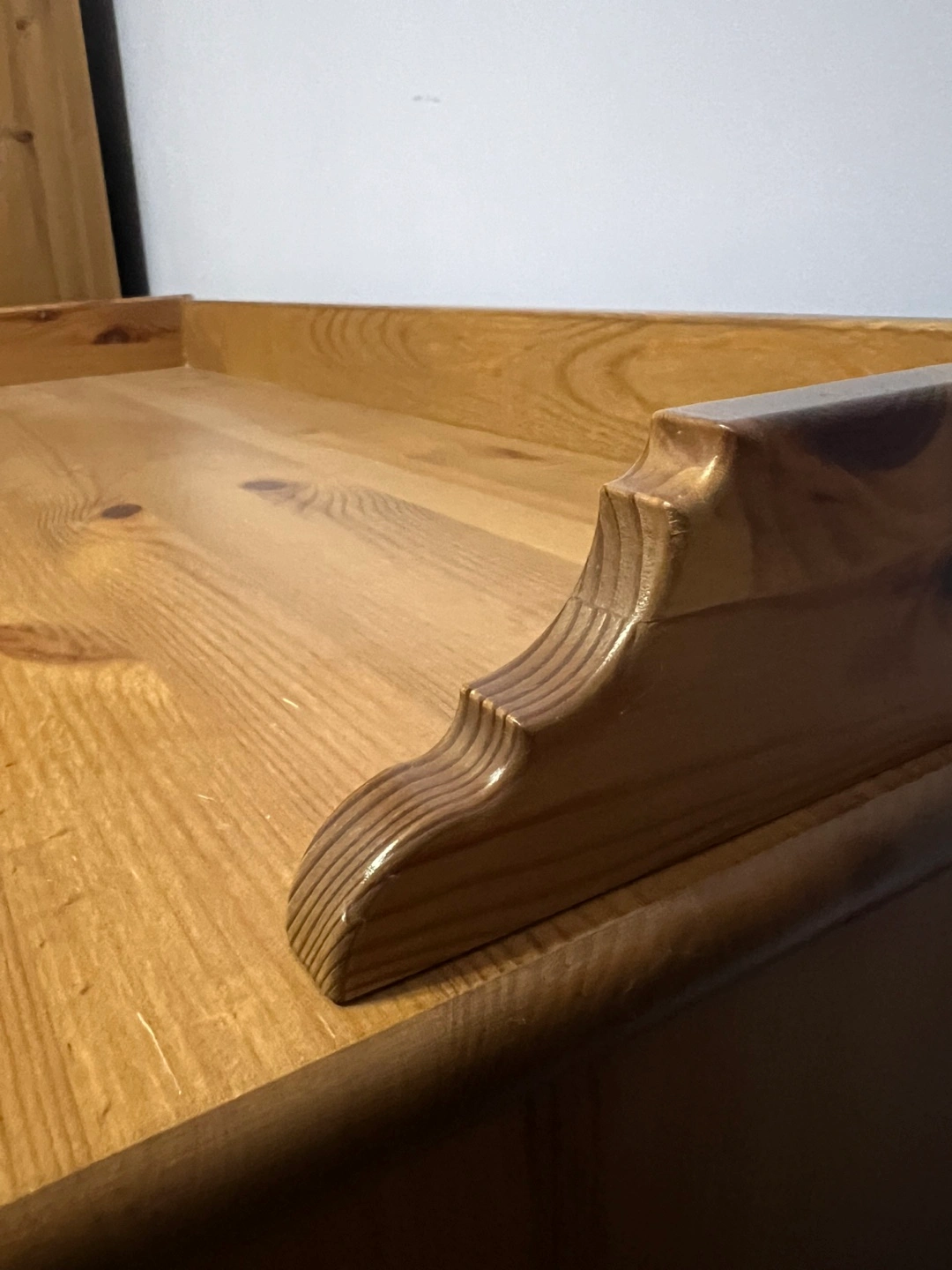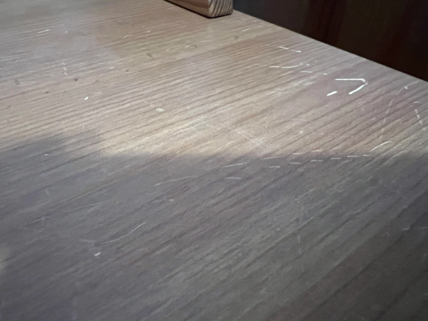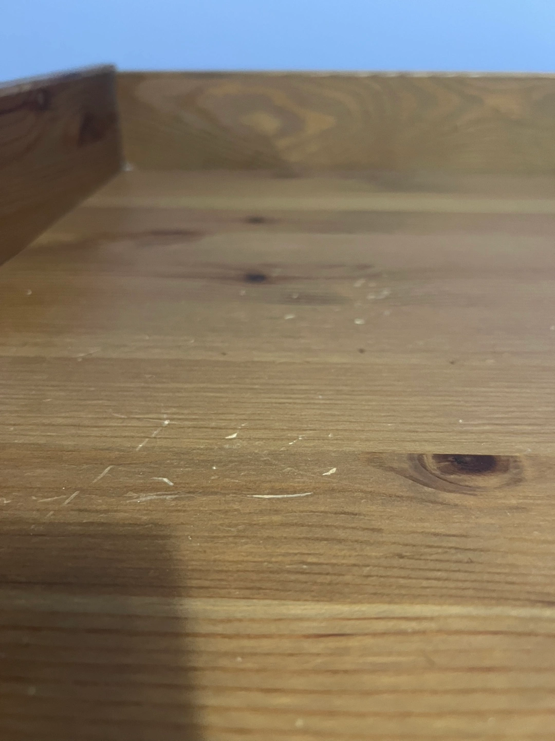 There are visible scratches and wear. See photos for scratches and crack in armoire door (doesn’t affect door use at all) On the Tallboy there are two handles missing on two drawers. The armoire has a bar to hang clothes and a shelf at the top