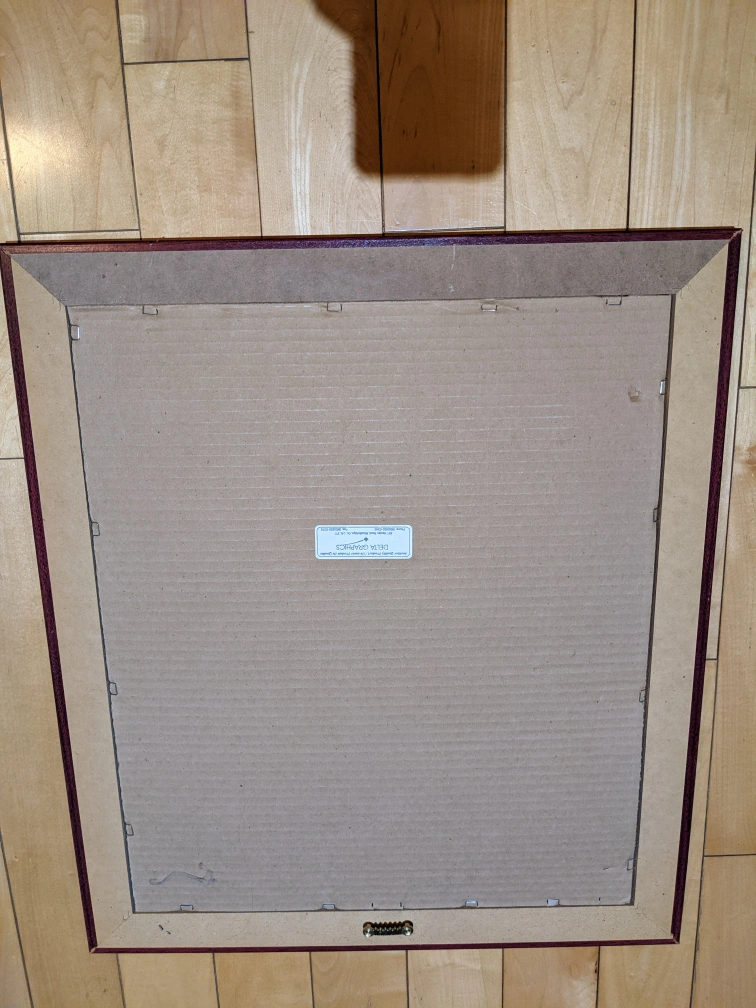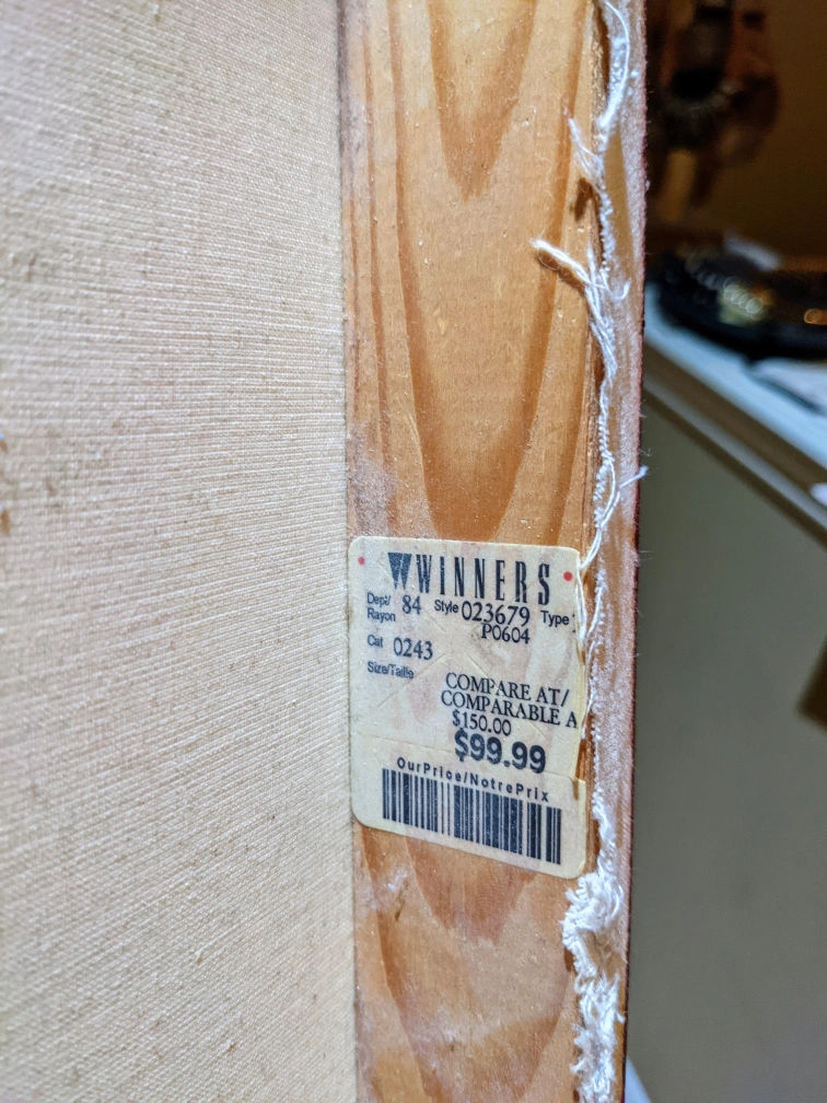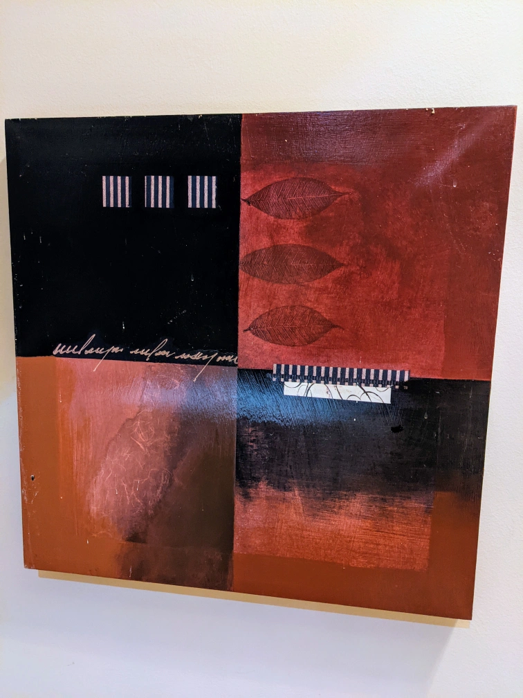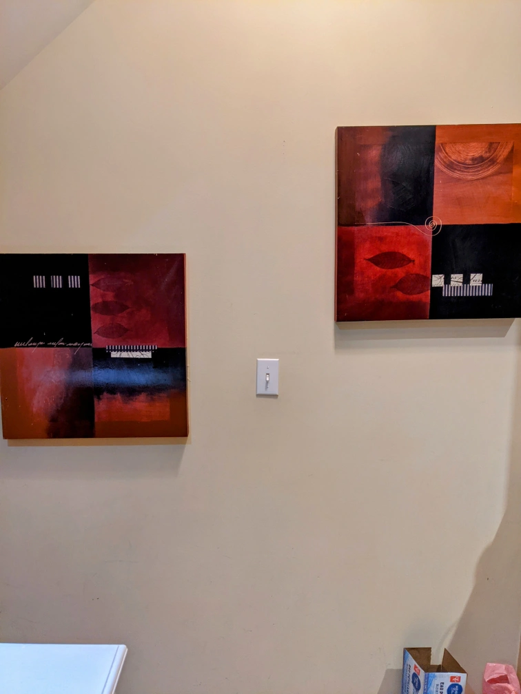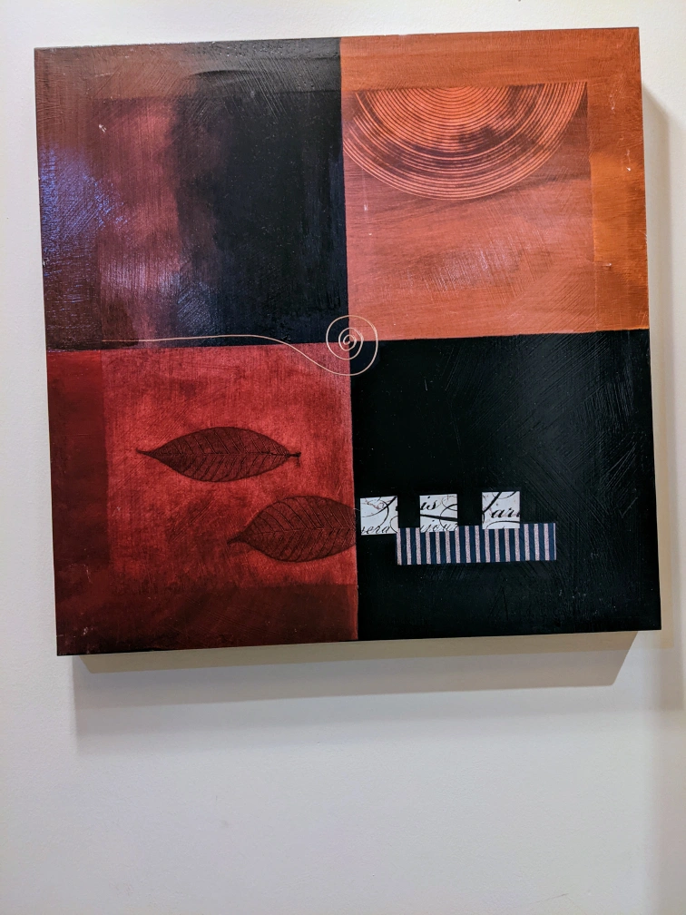 Set of two square canvas paintings. Red, brown, and black colour scheme. Abstract designs. Leaves and lines featured. Purchased from Winners.