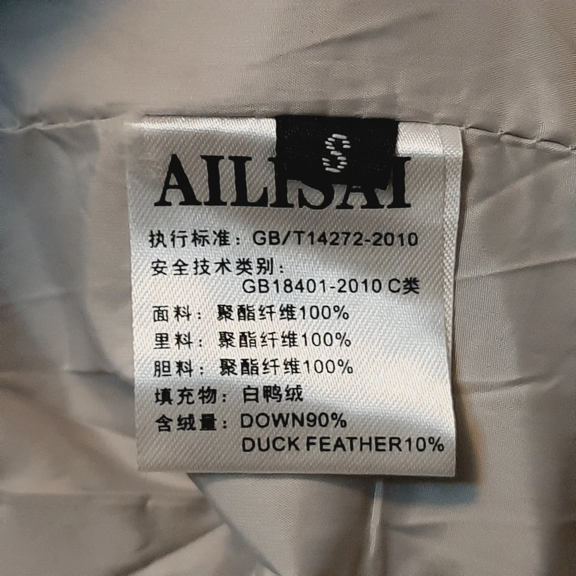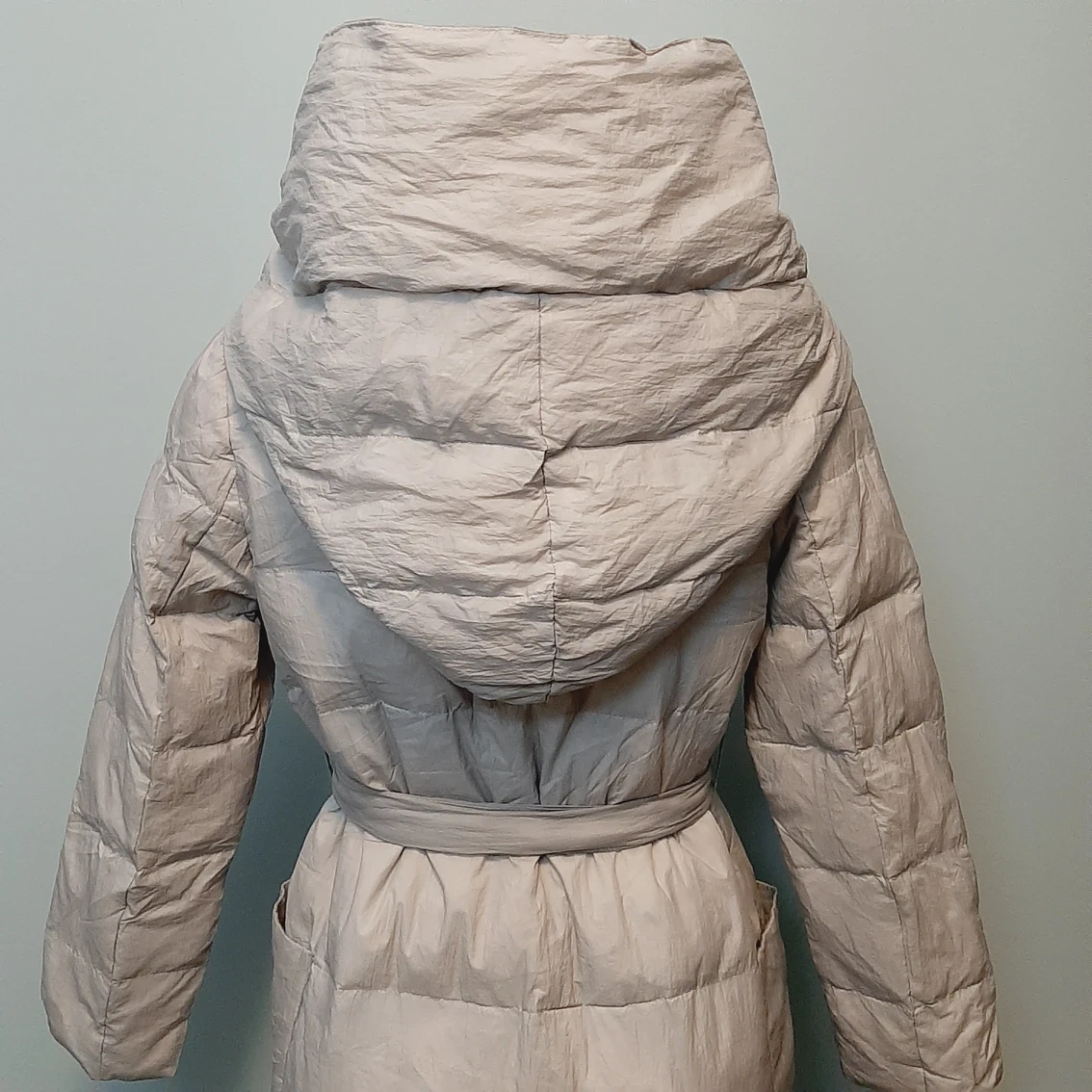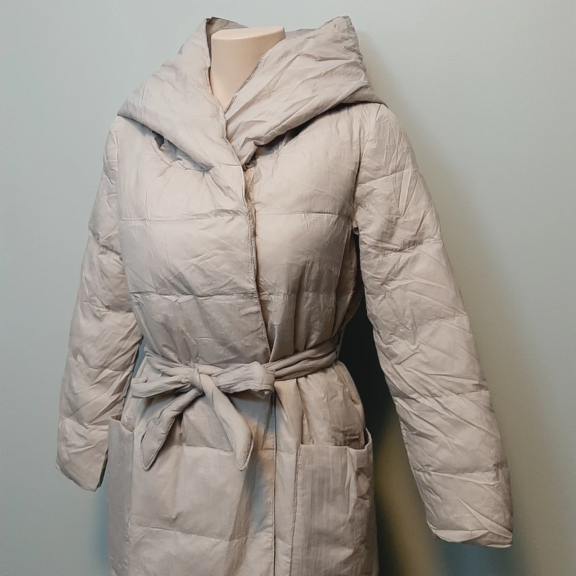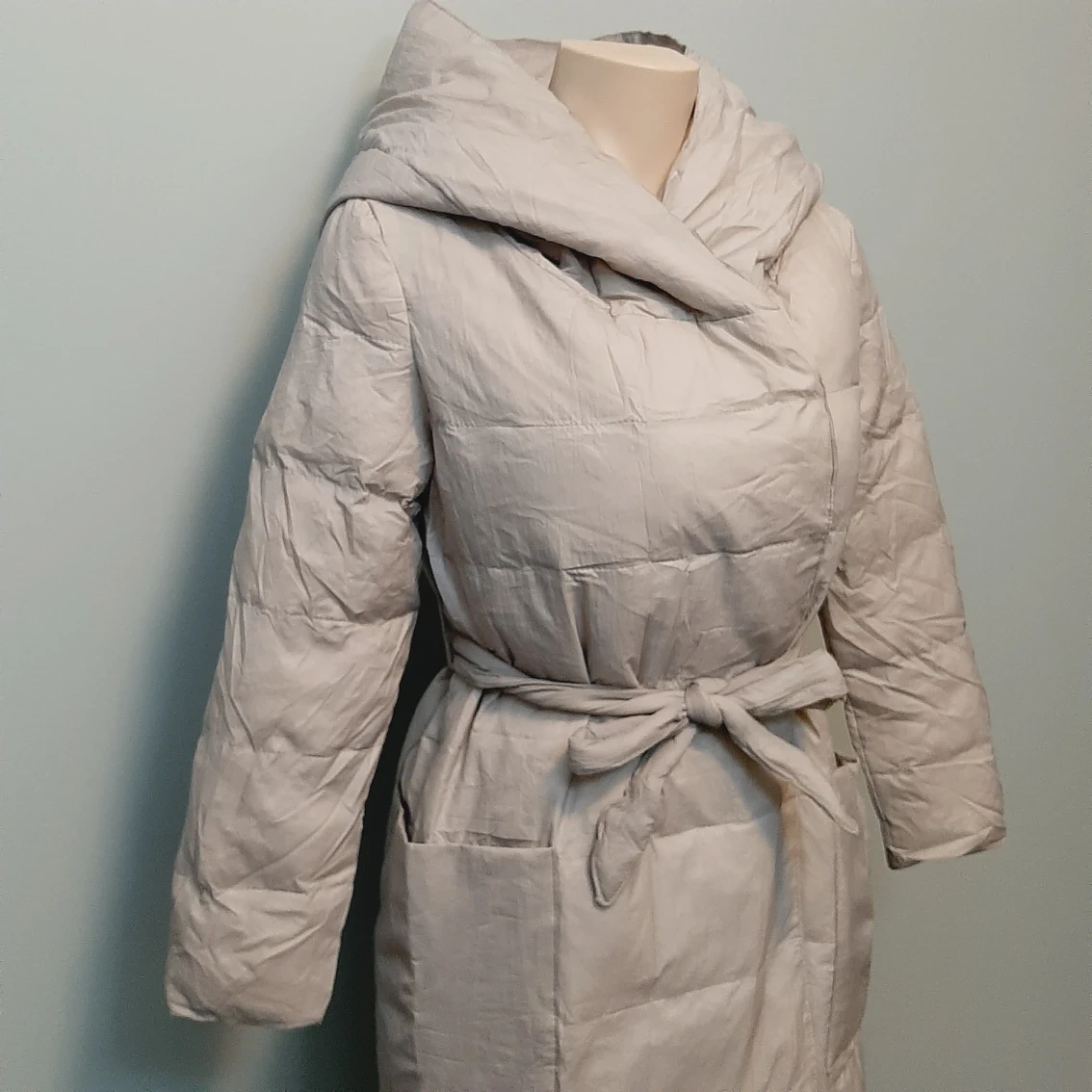Brand new down jacket, never been worn, only tried and washed once. 90% white duck down, 10% feather. Light weight suitable for late fall and early winter. The color is more light gray than beige.