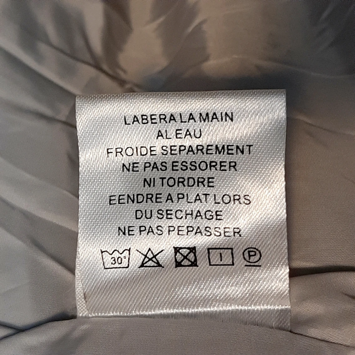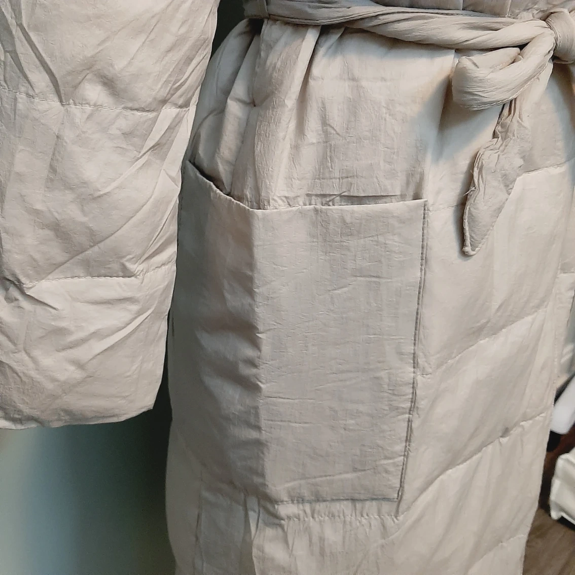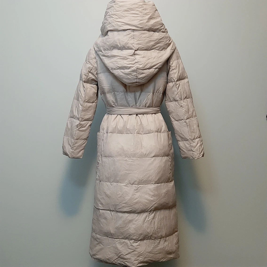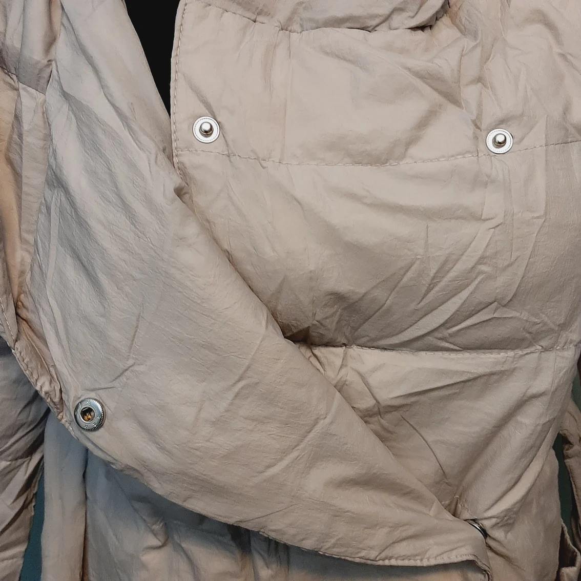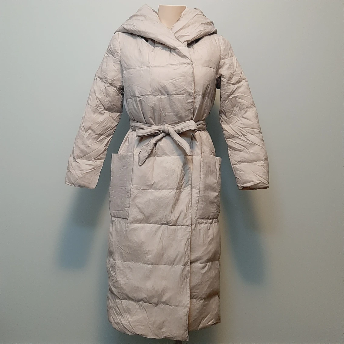 Brand new down jacket, never been worn, only tried and washed once. 90% white duck down, 10% feather. Light weight suitable for late fall and early winter. The color is more light gray than beige.