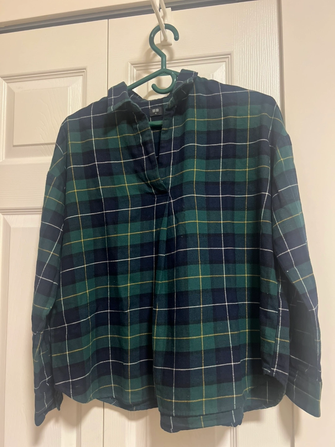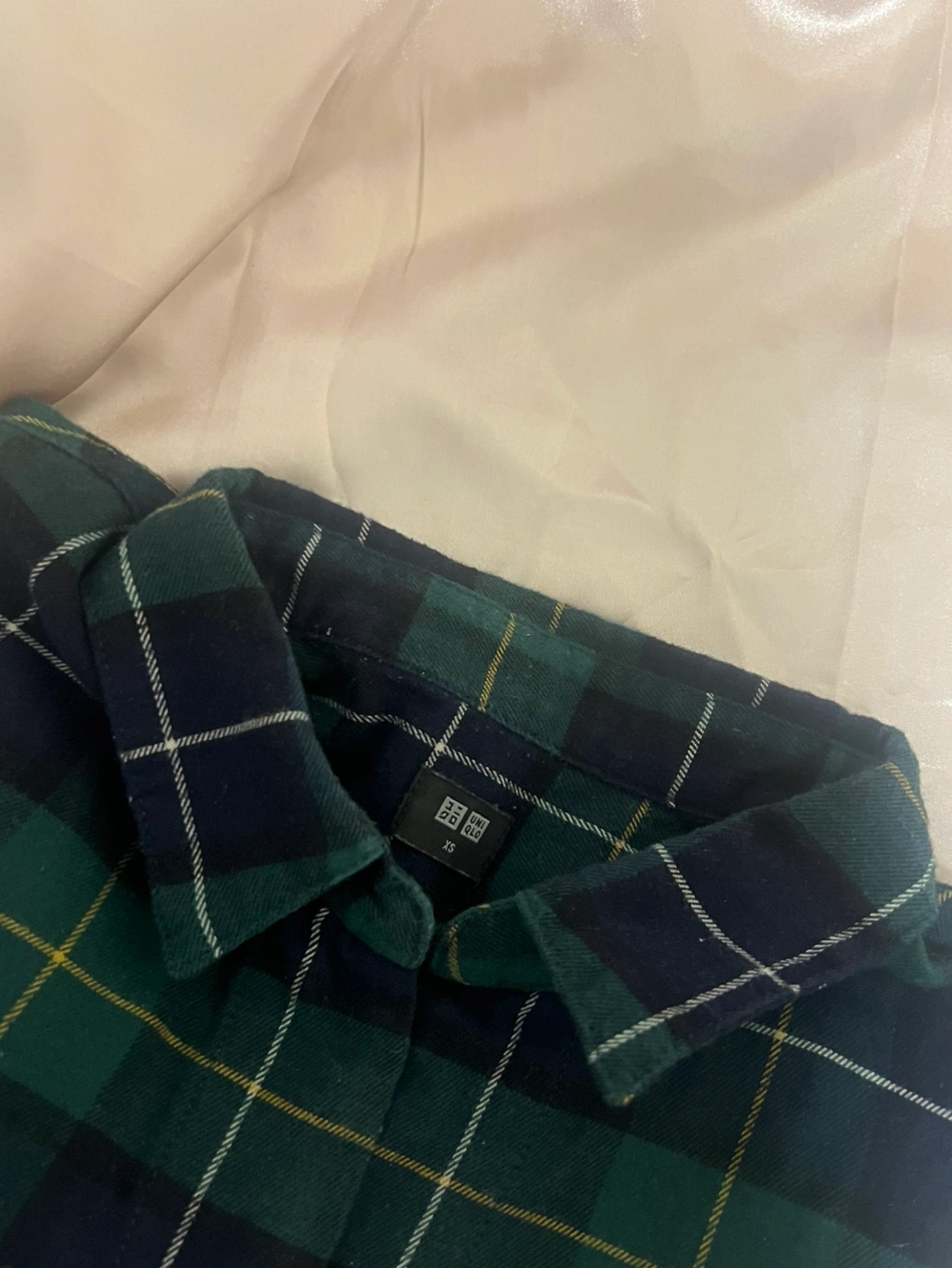 279Women's UNIQLO green and navy plaid long-sleeve shirt. Size XS. Relaxed fit. Collared. —- MOVING OUT SALE please check out my other listings! Have some great deals. :)