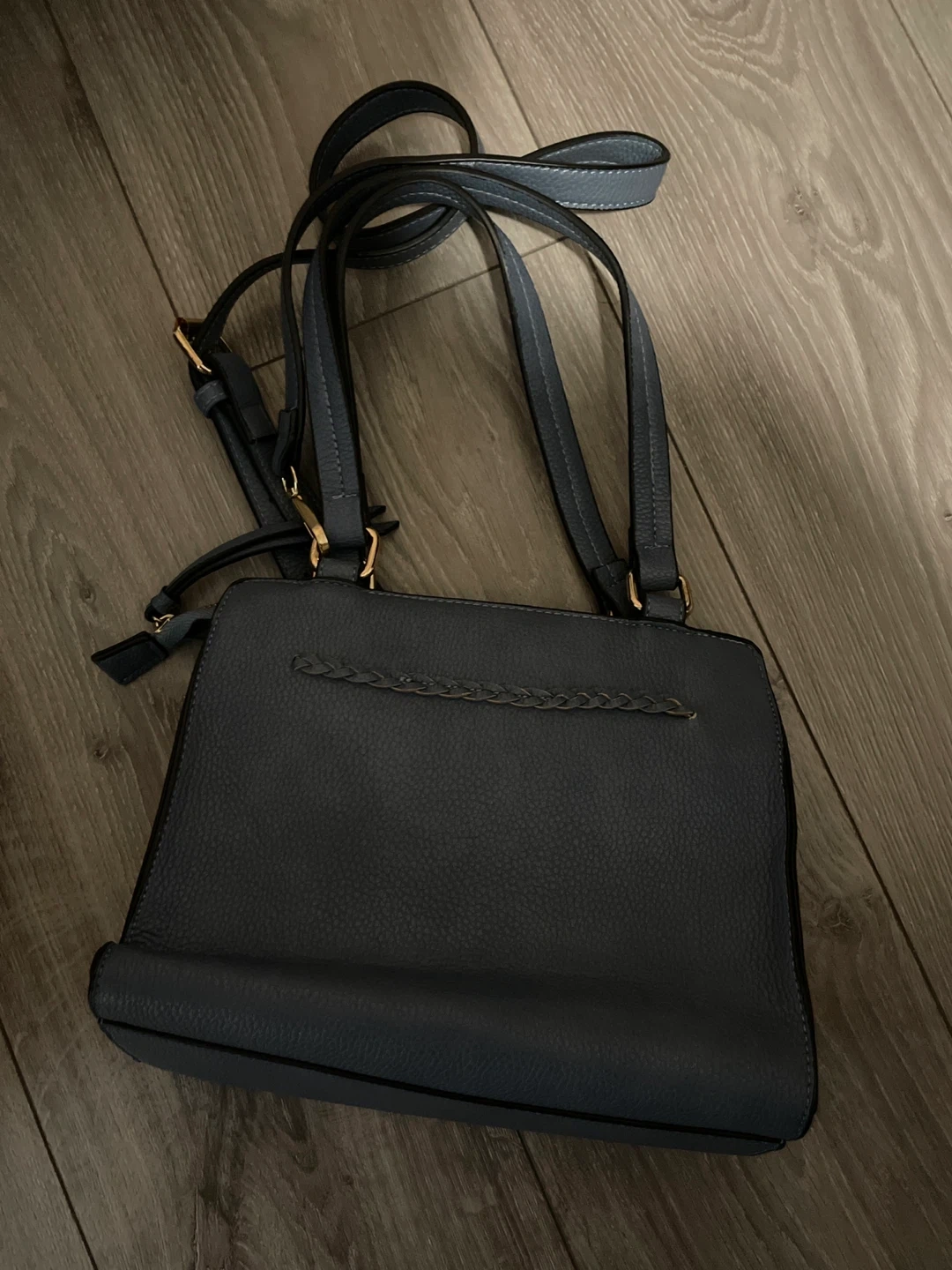 This is a Kate & Alex purse with an adjustable crossbody strap. It's made of polyurethane material with a 100% lining. It features a braided detail on the back and tassels on the front.