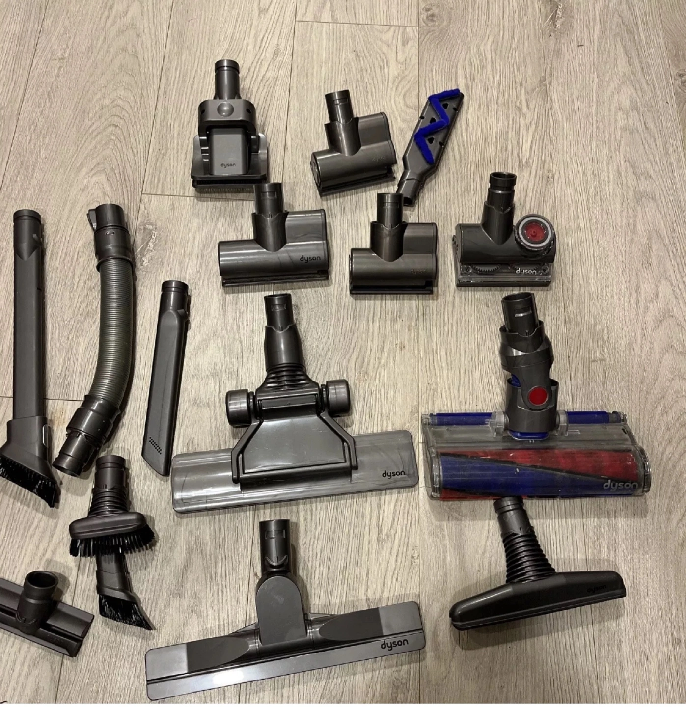 Various Dyson vacuum cleaner attachments. Includes floor tools, crevice tools, and brush heads. All in good used condition. Perfect for cleaning hard to reach areas.