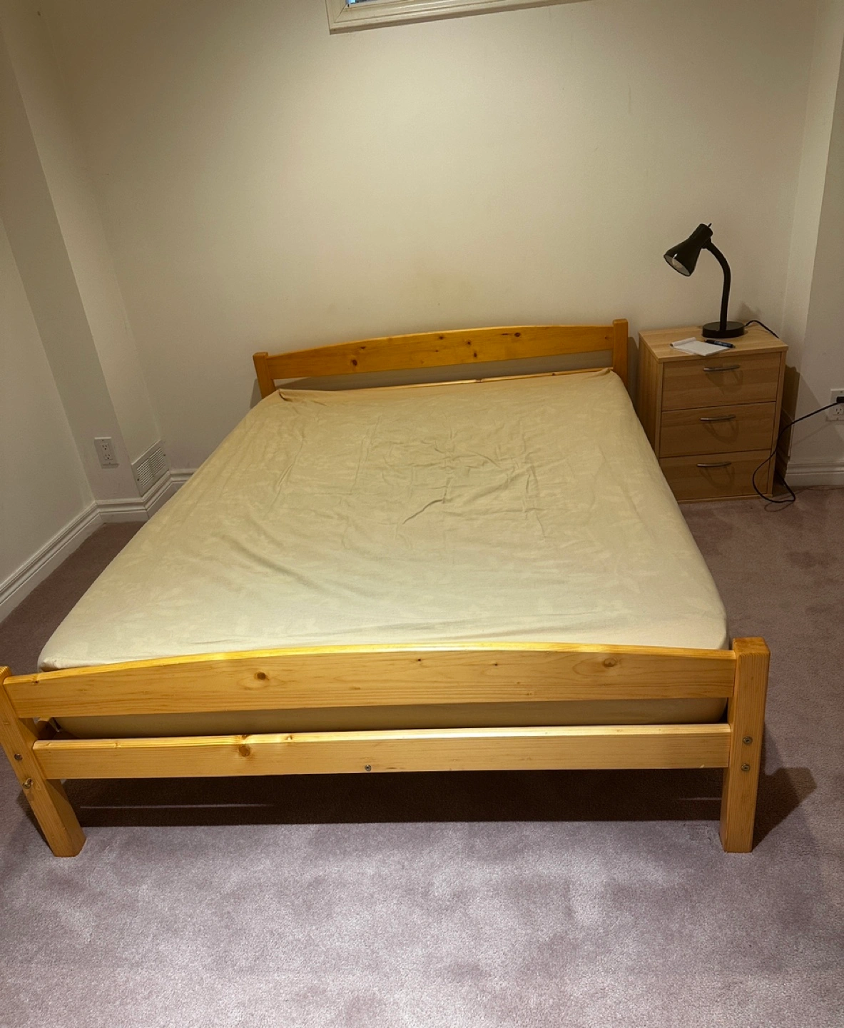 Solid wood double bed frame, Excellent condition. Simple, functional design. Mattress is included.