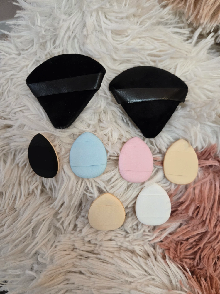 701Set of assorted colour makeup sponges. Includes four egg-shaped sponges in a resealable bag and two additional larger black velvet poufs. Perfect for applying makeup.