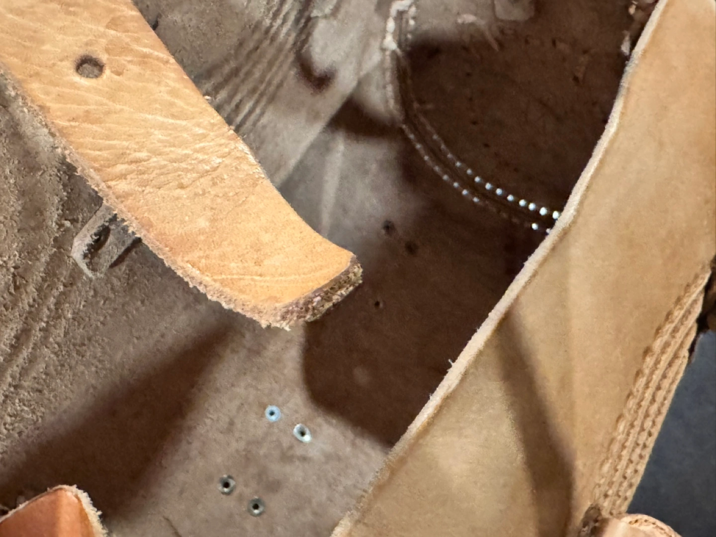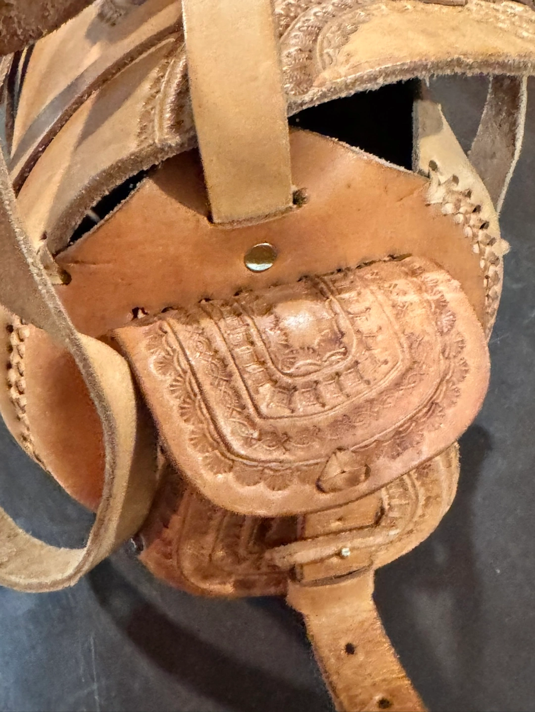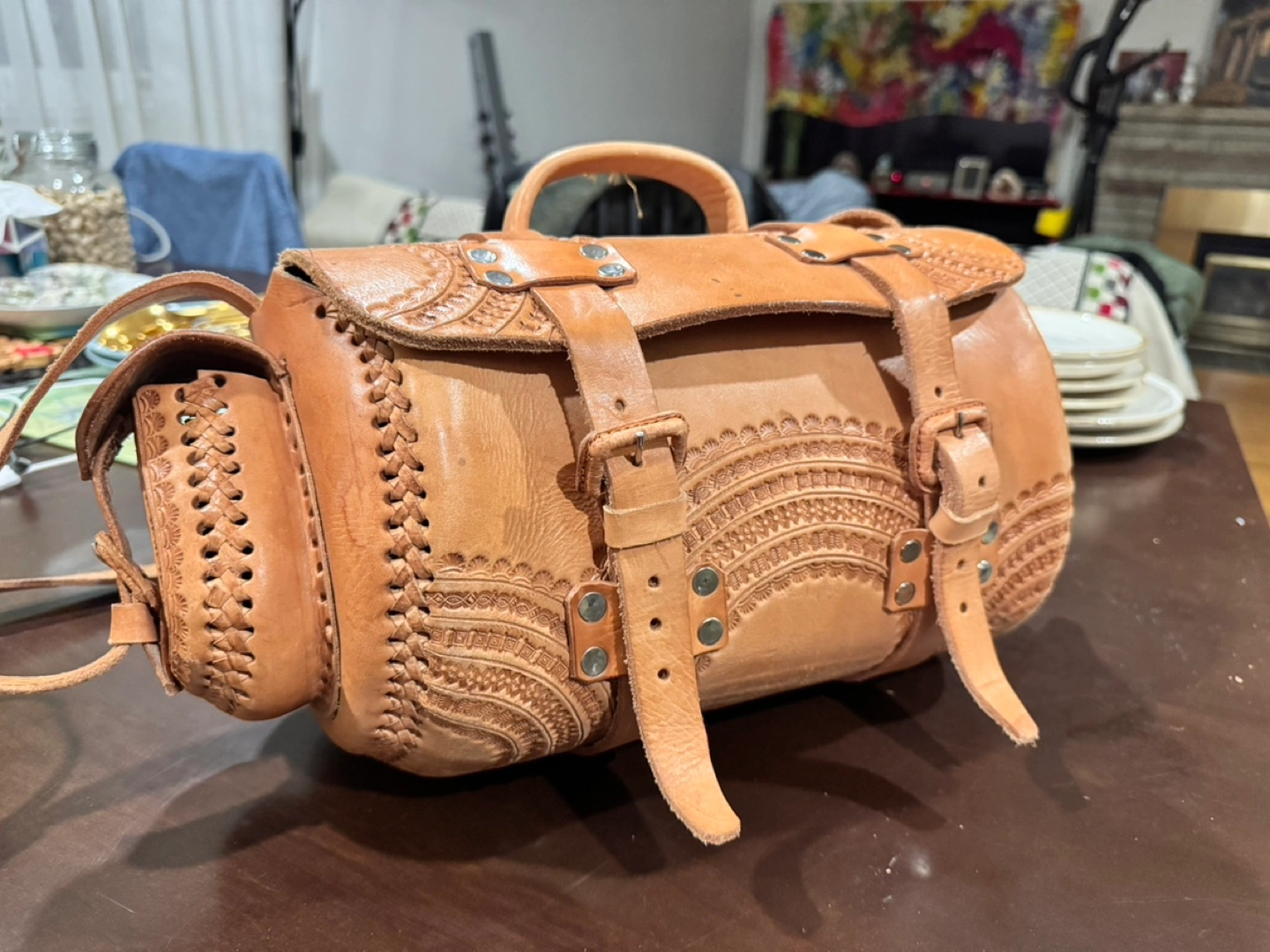 Unique, handcrafted leather bag. Intricate tooled designs. Features a smaller pouch. Adjustable shoulder strap. Buckle closures. Light brown colour.