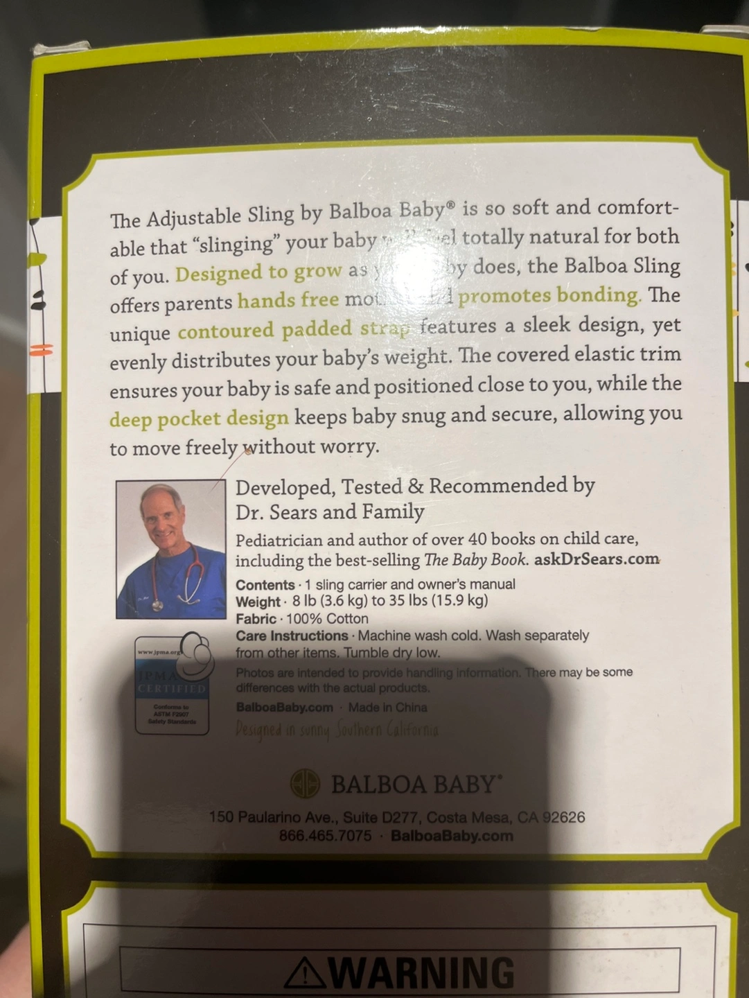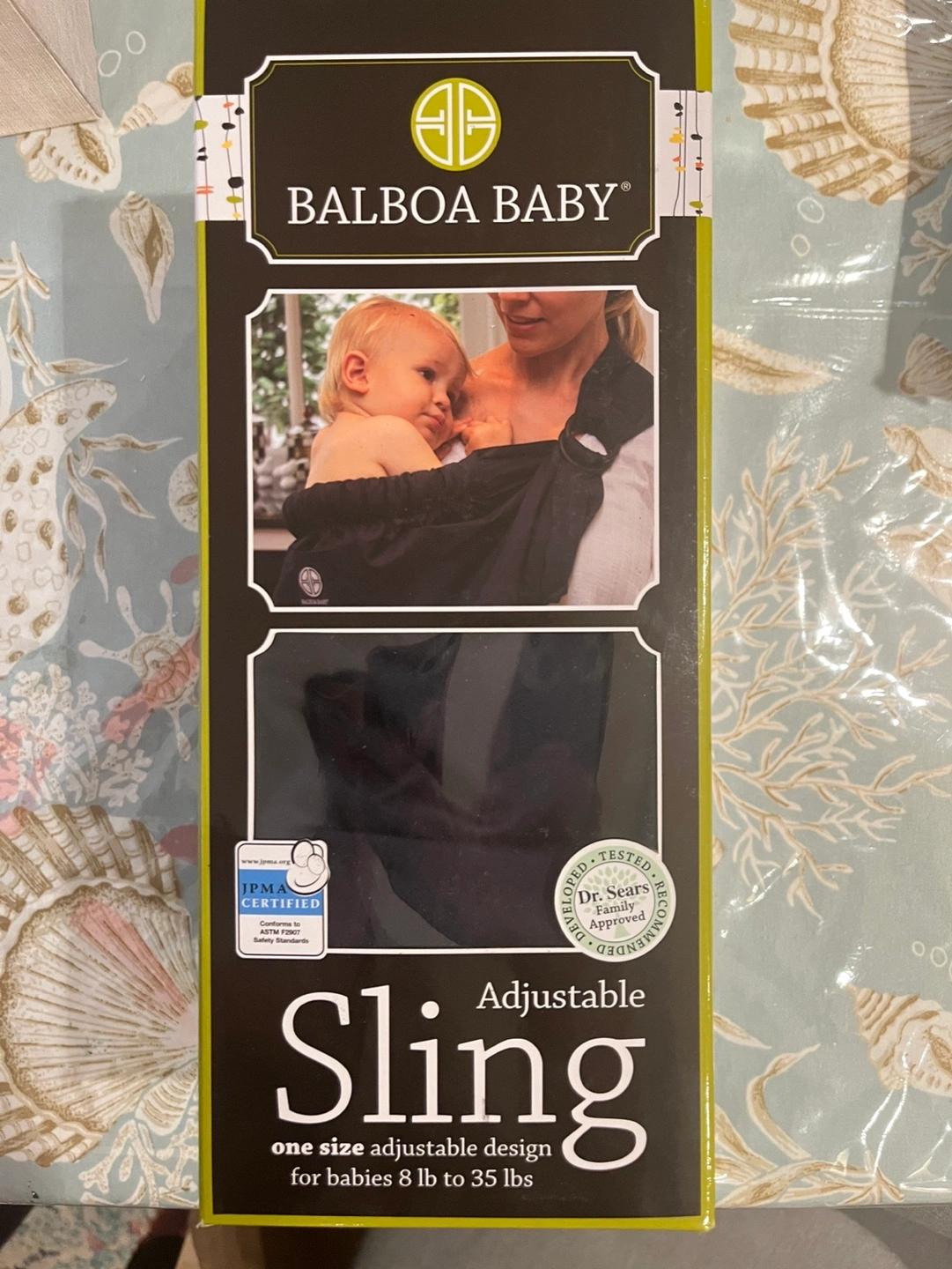 New in box. One size fits babies 8 to 35 lbs. Soft and comfortable. Features a sleek design, padded straps, and deep pockets. 100% cotton. Machine washable.