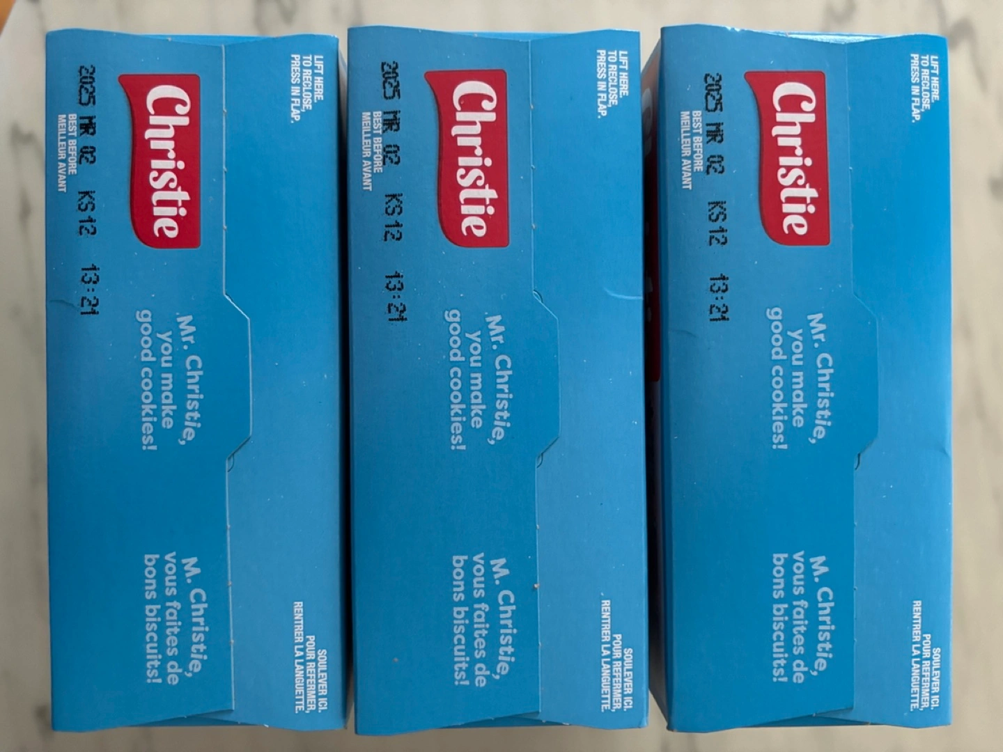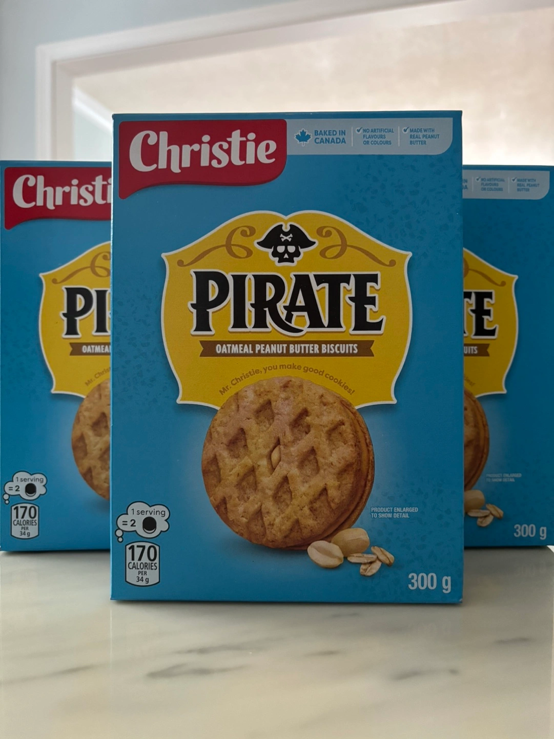 Three unopened boxes of Christie Pirate Oatmeal Peanut Butter Biscuits. 300g each. Baked in Canada. Made with real butter. No artificial colours.