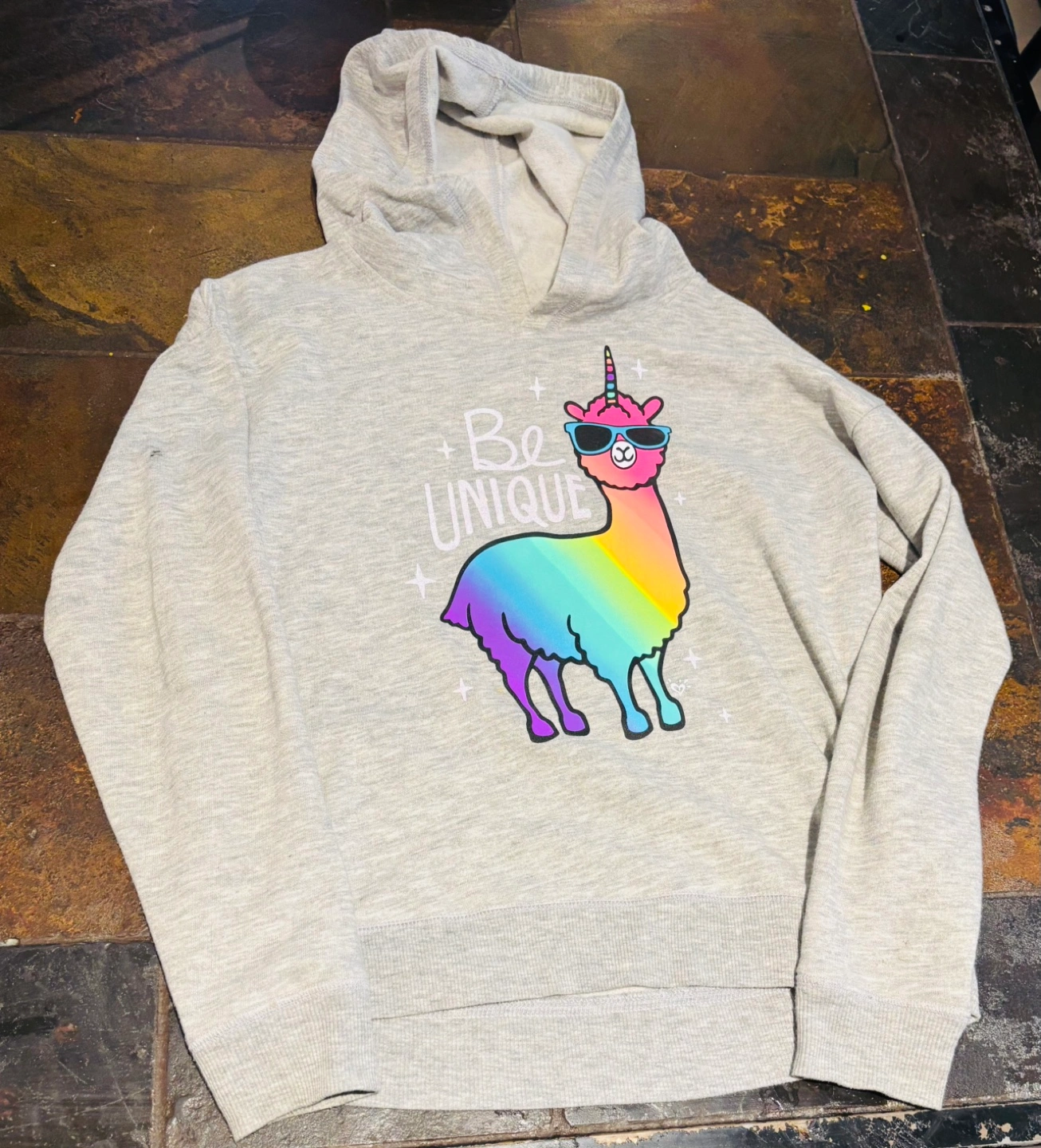 Grey hooded sweatshirt. Features a rainbow llama graphic and the text "Be Unique". Long sleeves, pullover style.