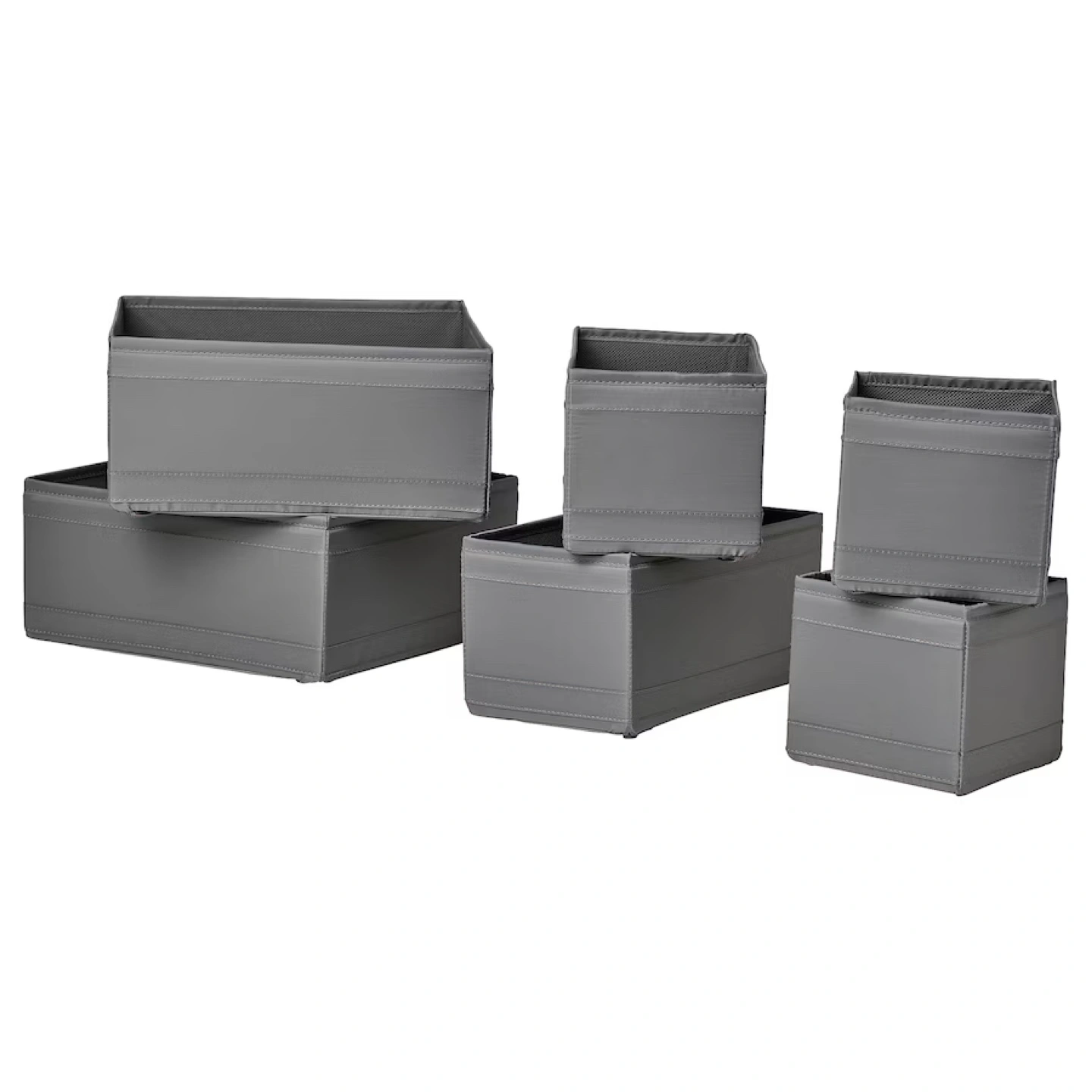 Set of six grey fabric storage boxes. Perfect for organizing closets, shelves, or drawers. Various sizes included.