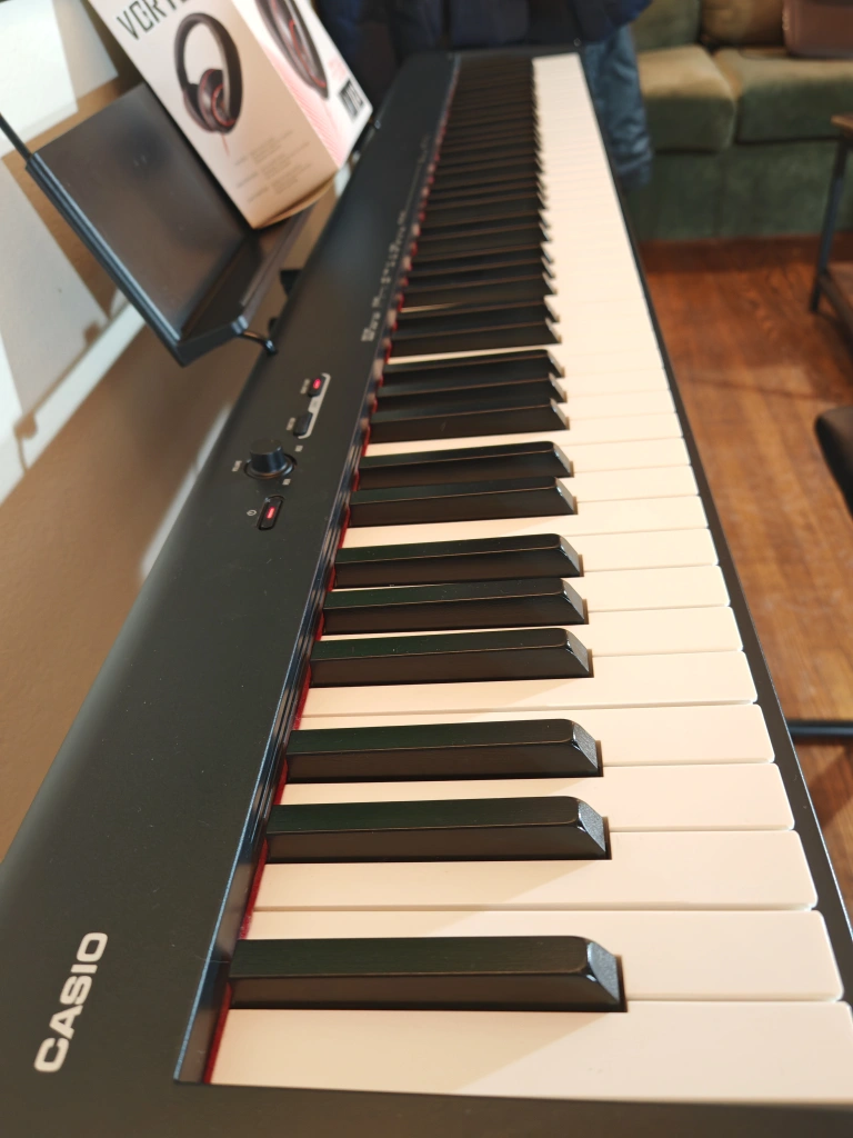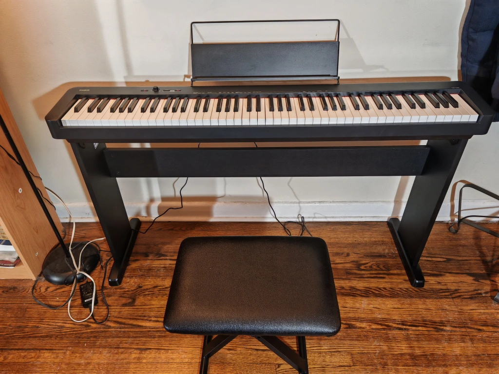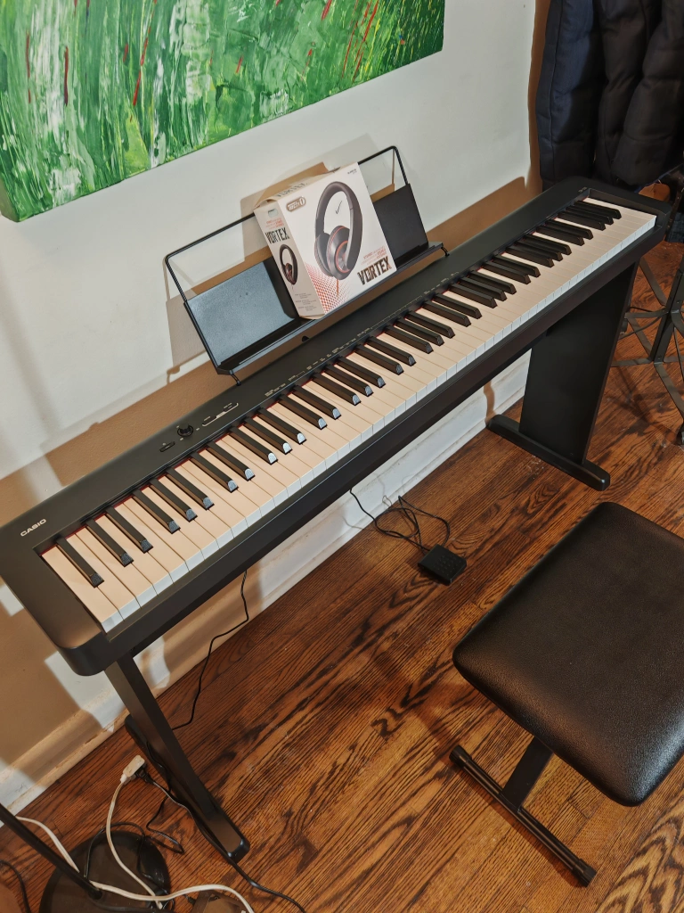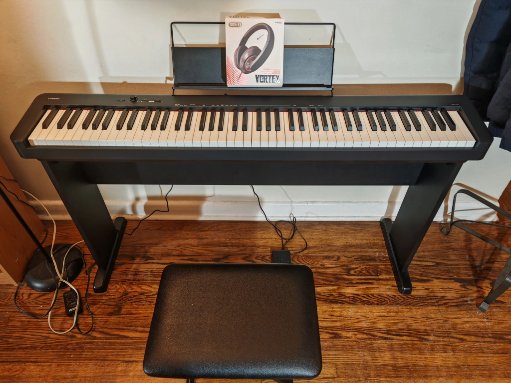 160Casio CDP-S100, 88 fully weighted keys digital piano new condition. Never used. It comes with stand, music rest, power adapter, headphones, sustain pedal and stool. Casio has applied its highly compact construction technologies to achieve a size that is even smaller than previous CDP series. This compact piano can be played anywhere, in your own style.