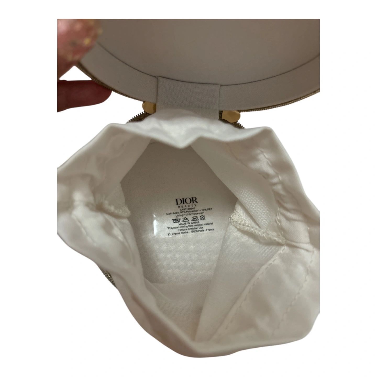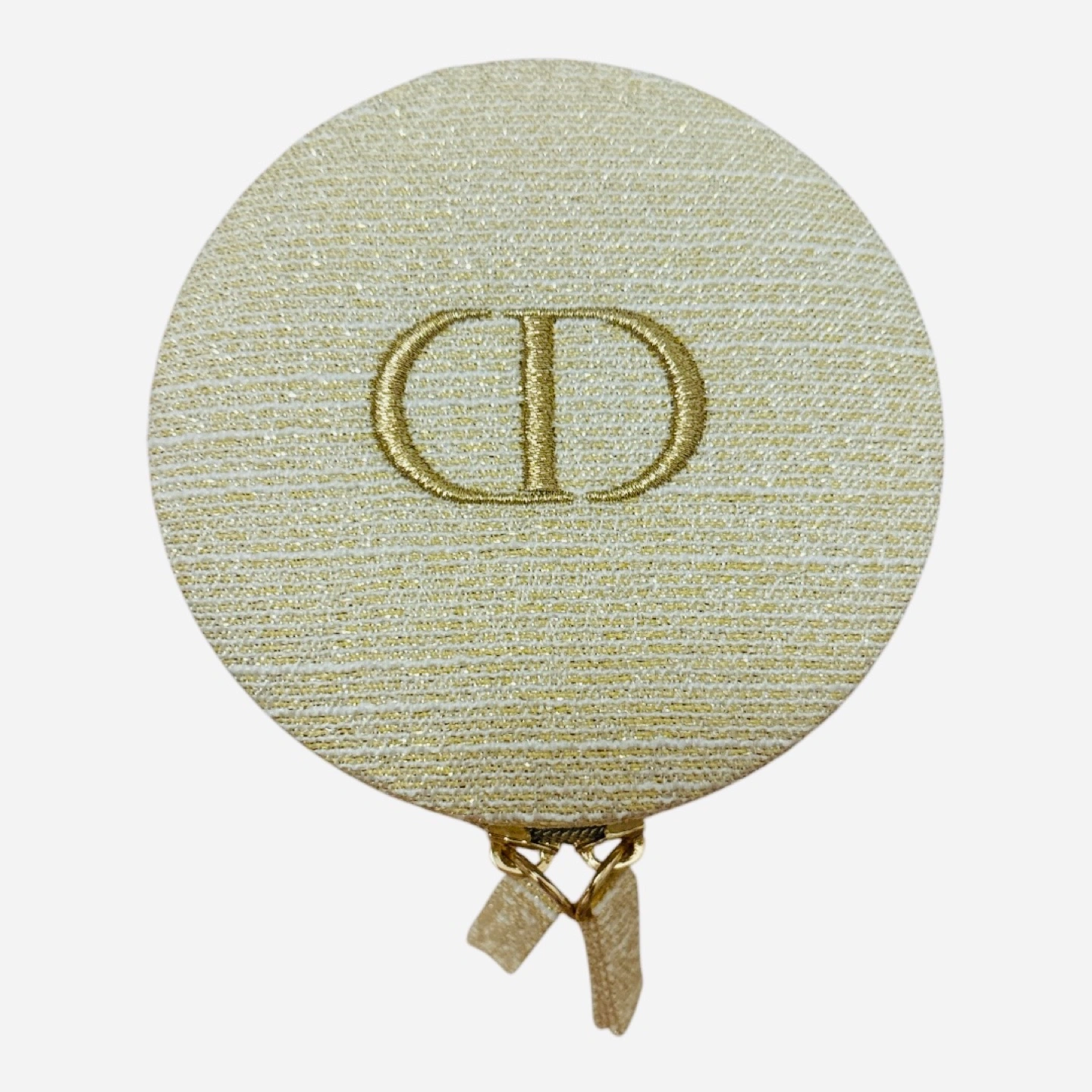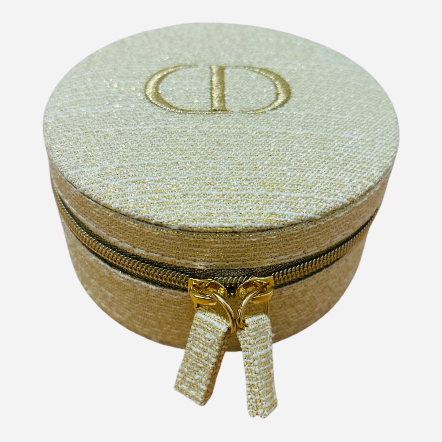 Circular Dior jewellery case. Gold shiny fabric exterior. Zipper closure. Small interior pouch. Dior logo embroidered on top.